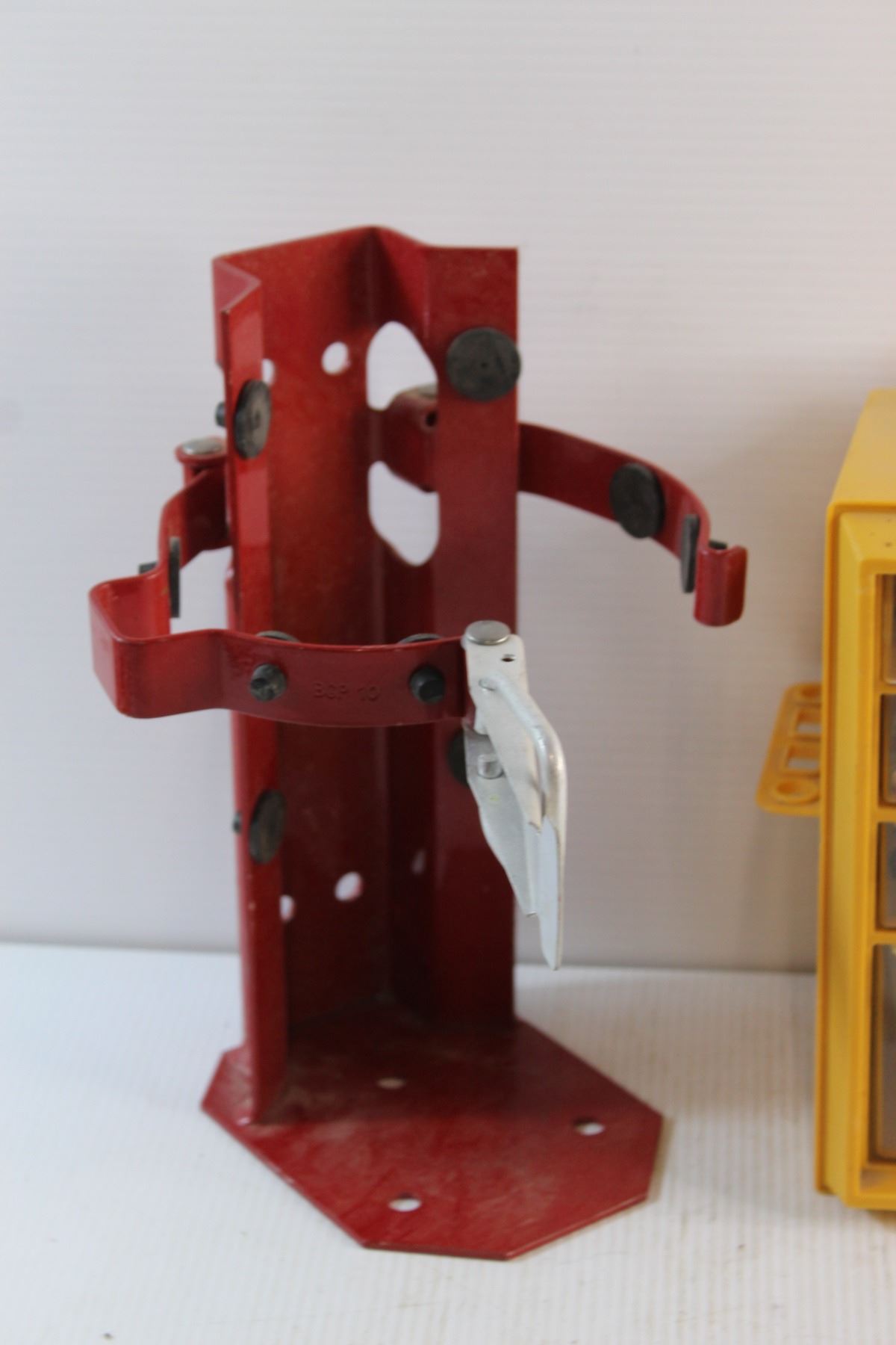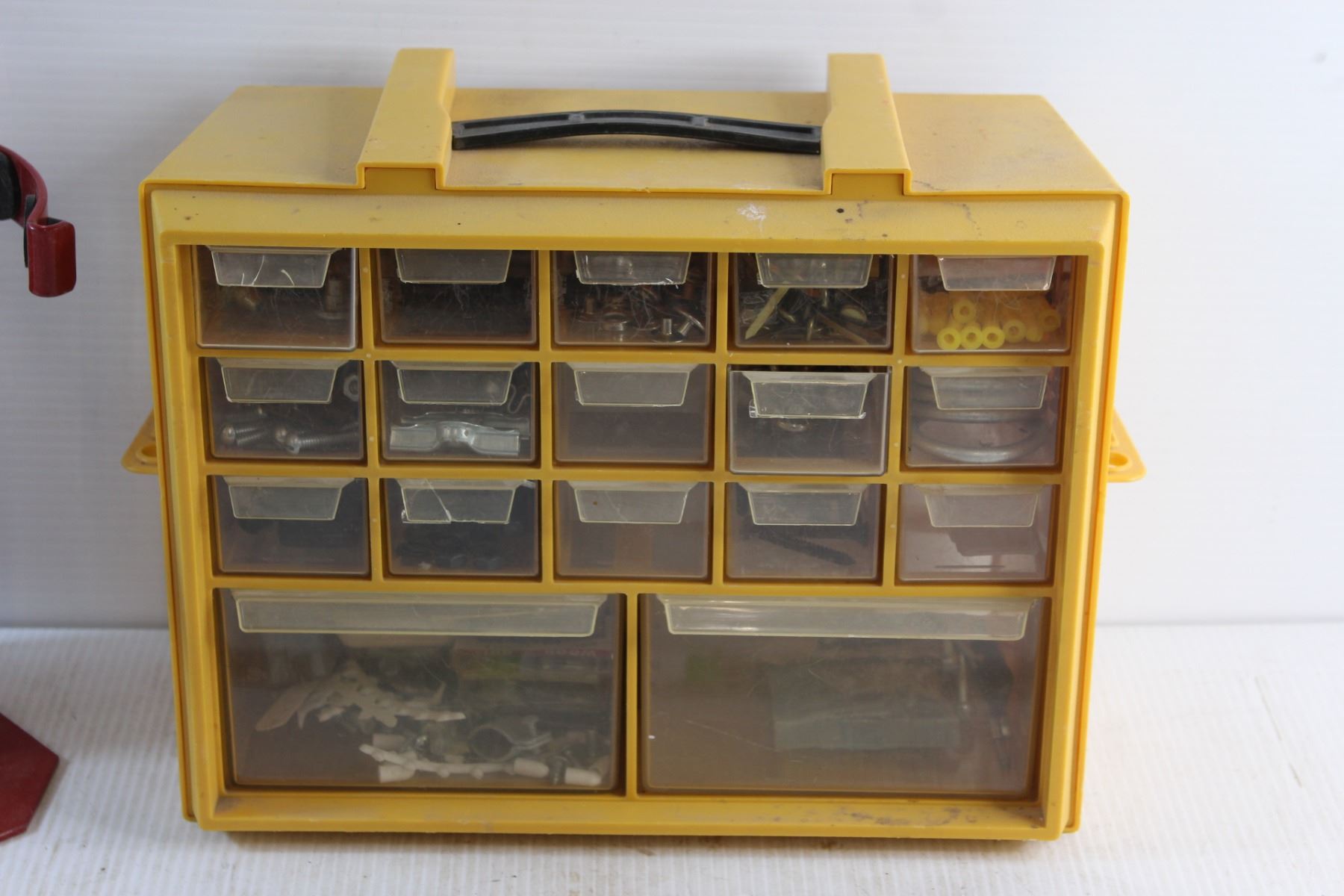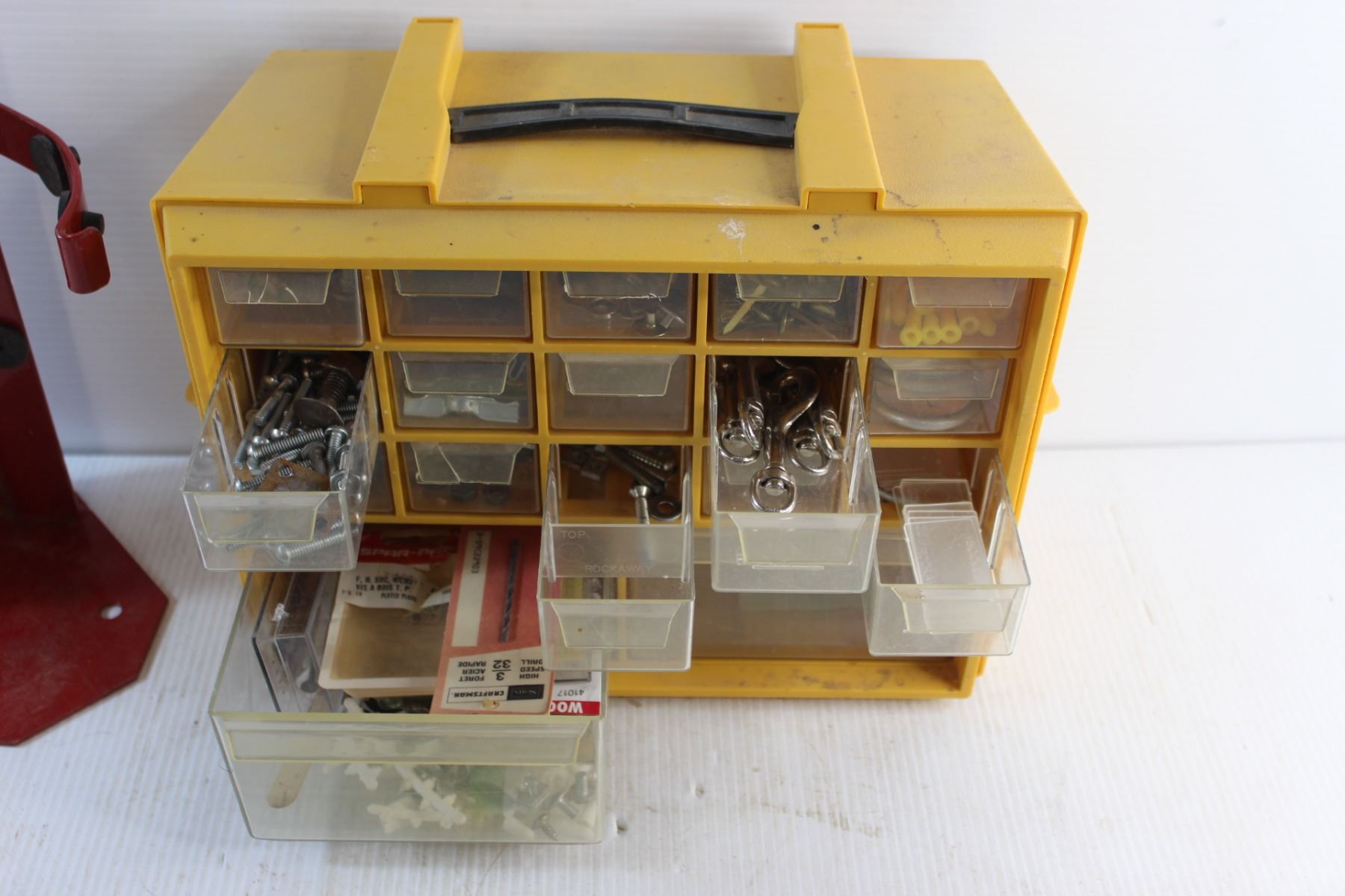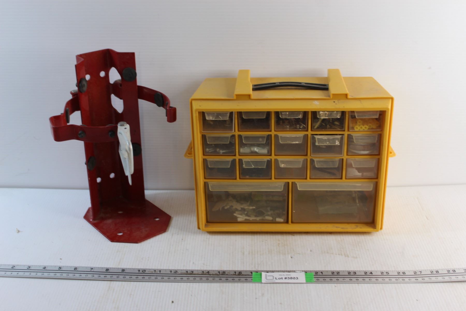 Tool Box Drawer with Assorted Hardware and Fire Extinguisher Wall Mount