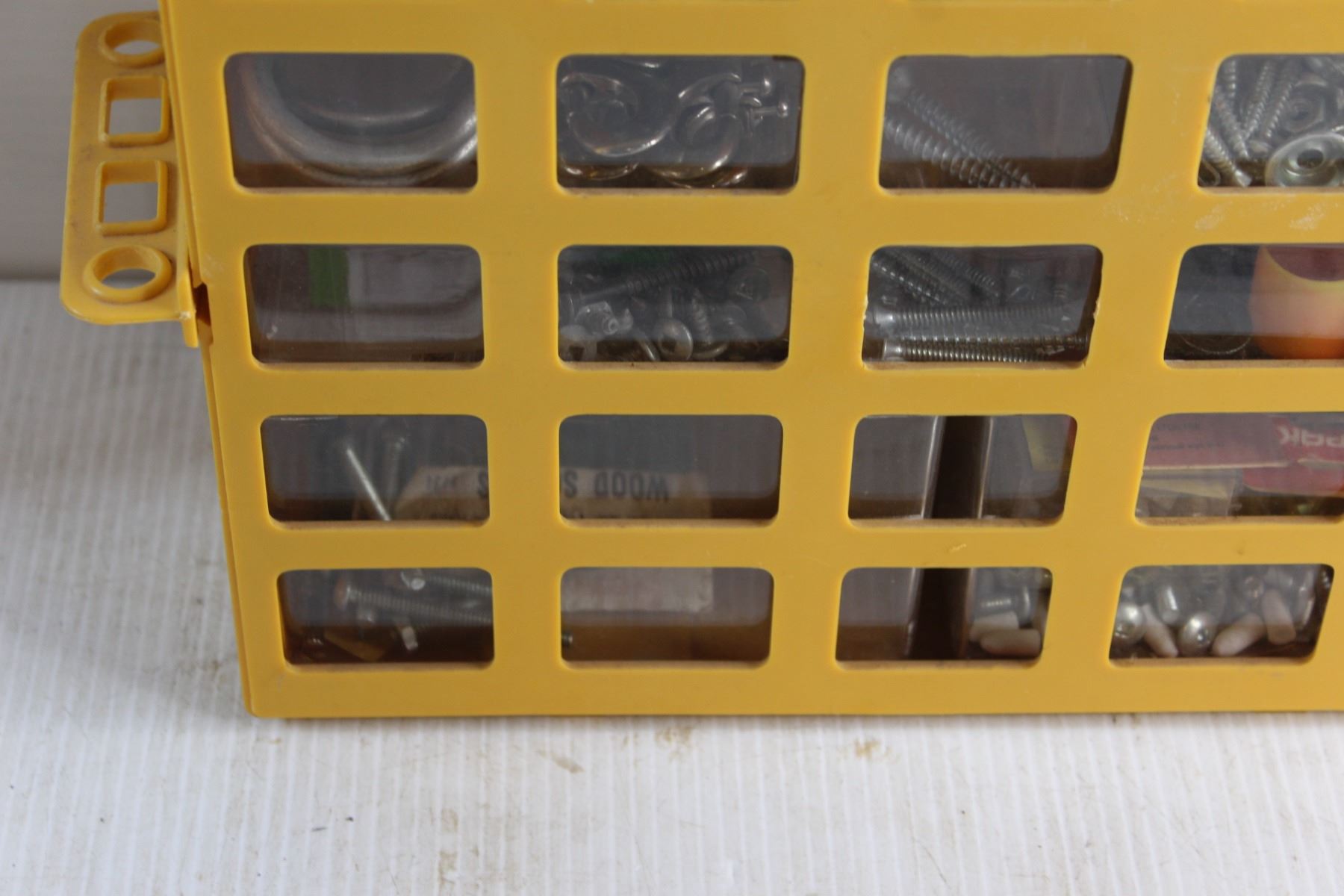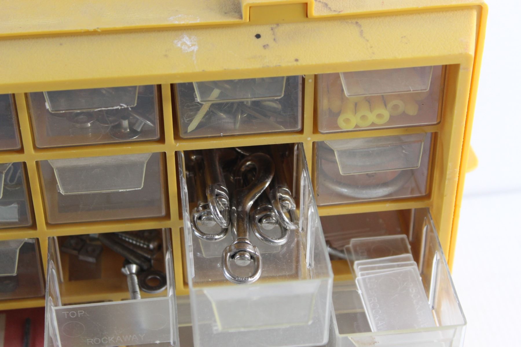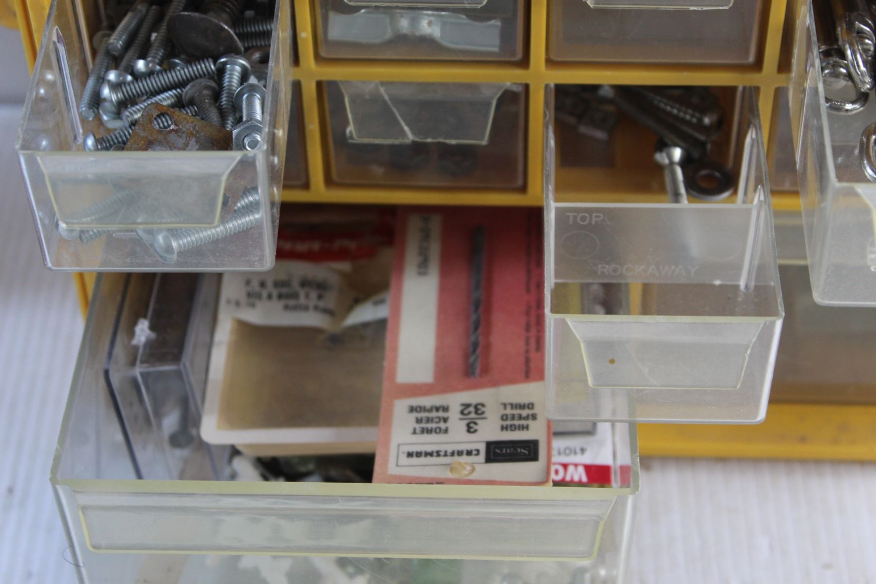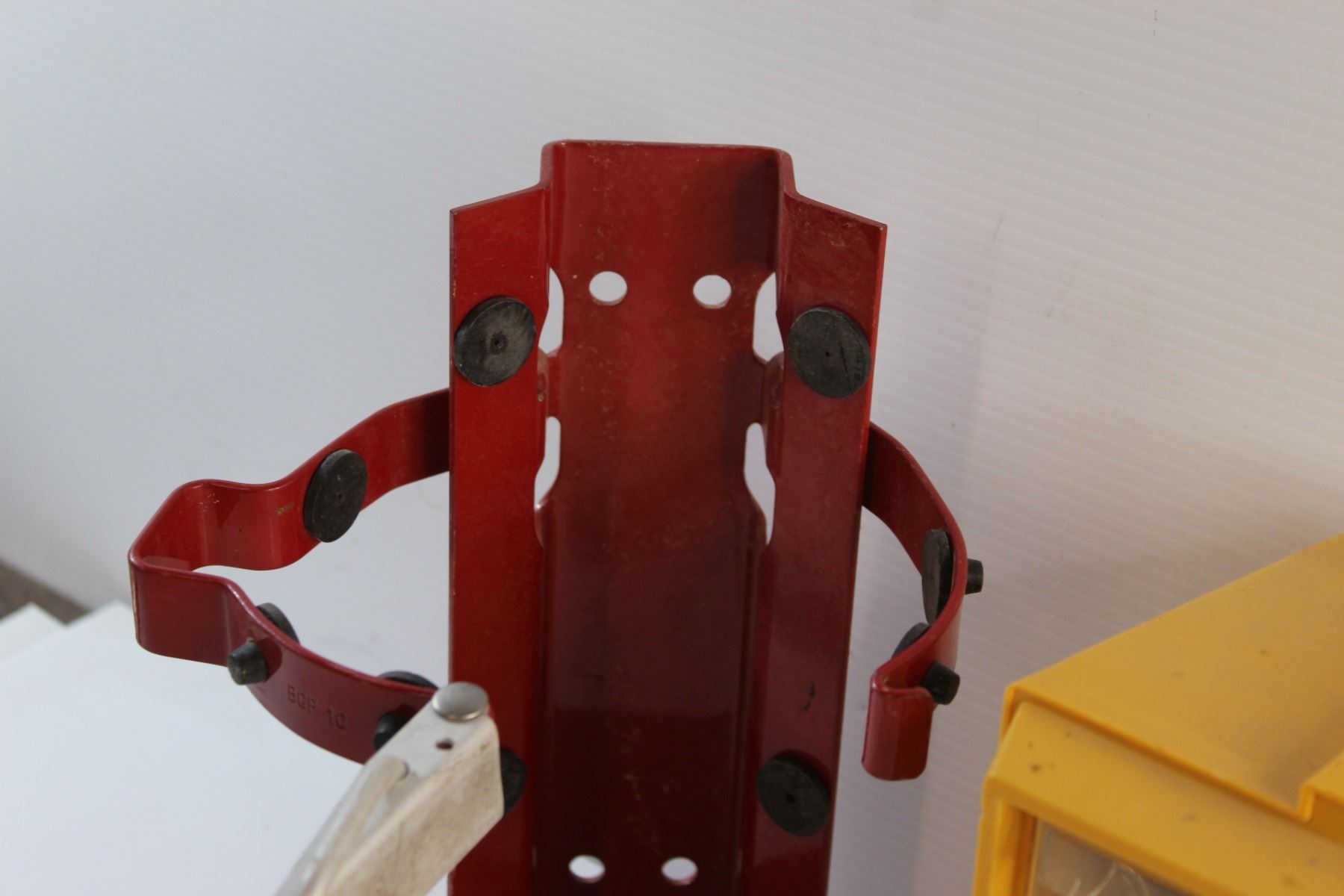 Tool Box Drawer with Assorted Hardware and Fire Extinguisher Wall Mount