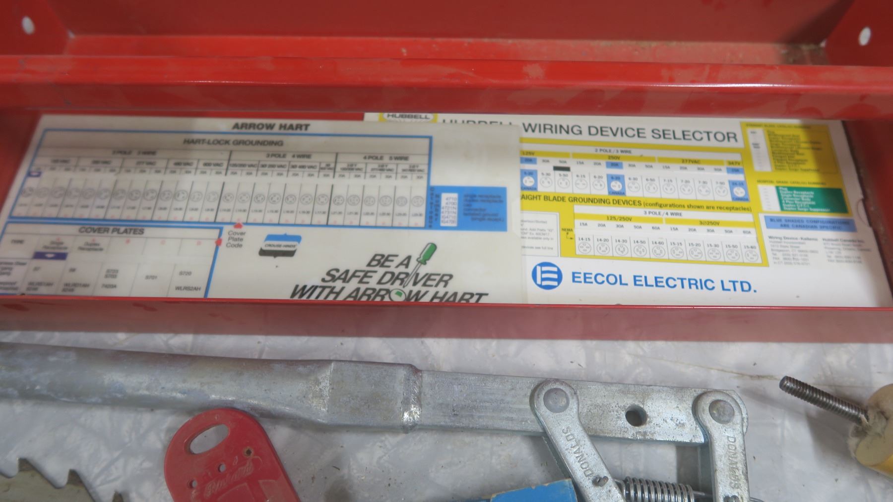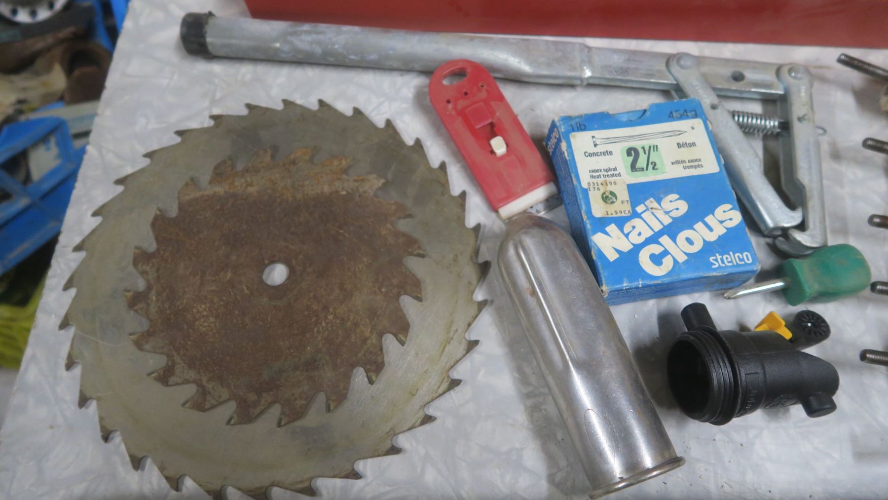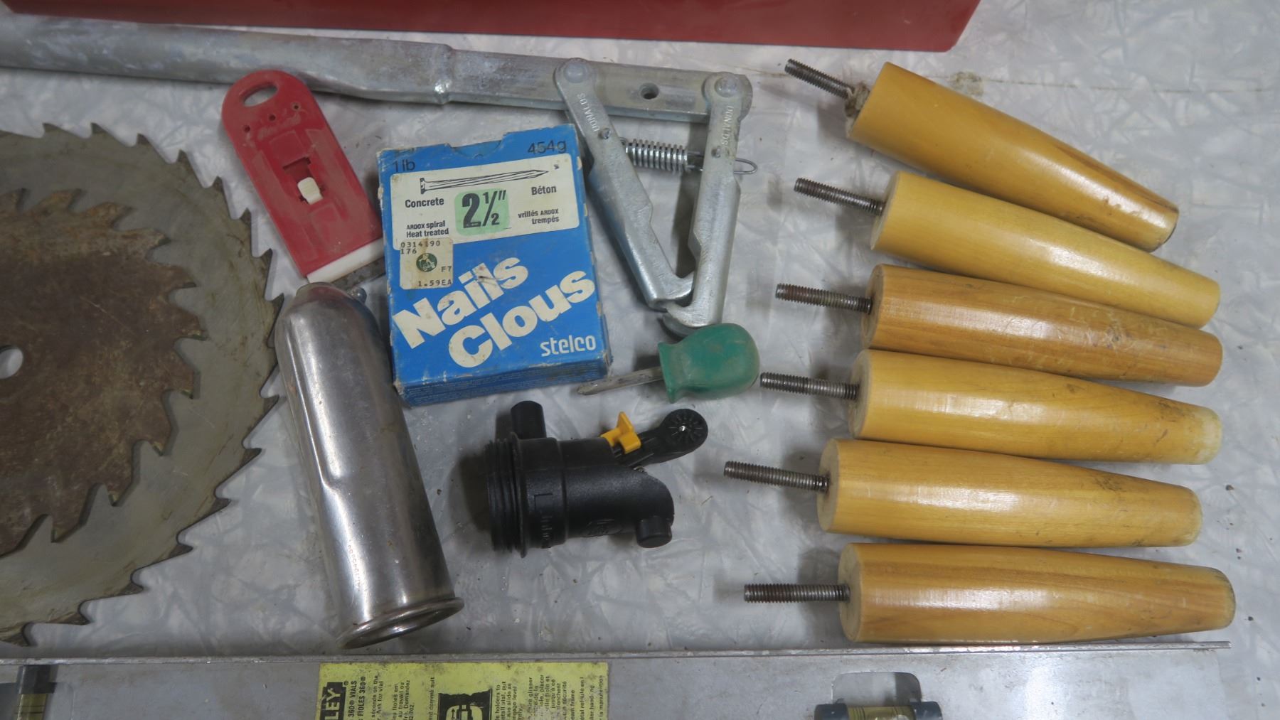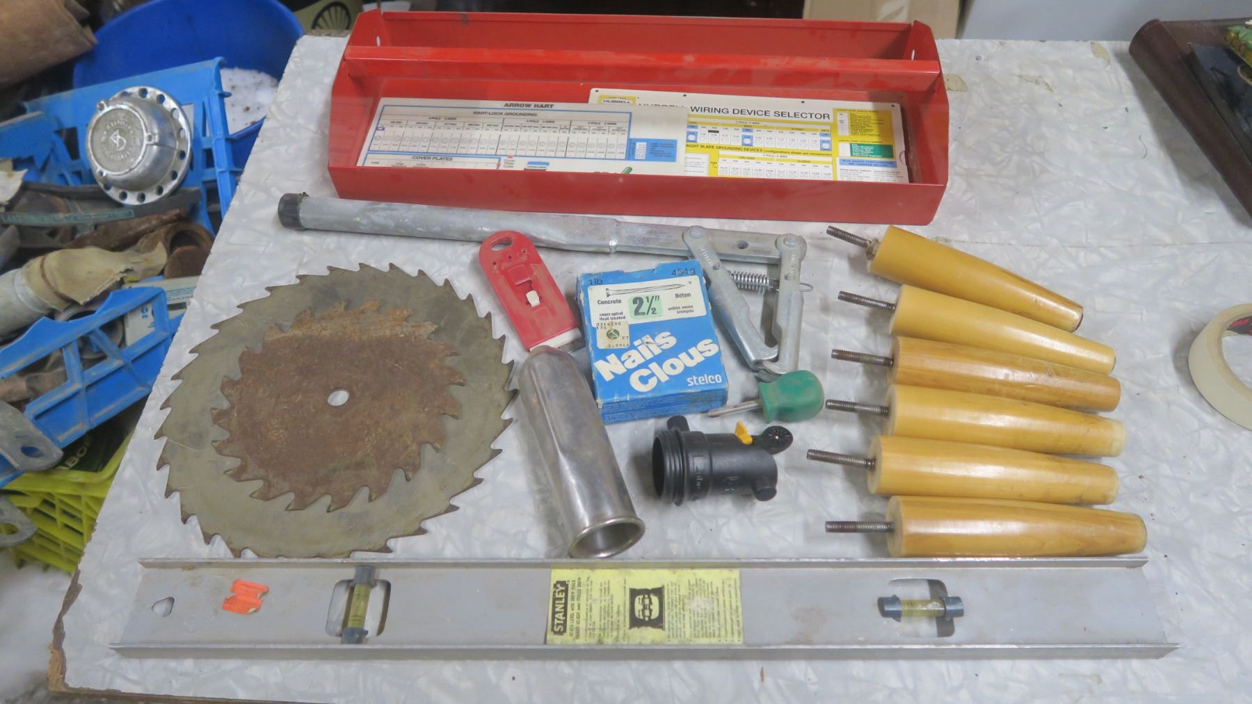 Tool Box Tray with Misc. Tools, Saw Blades, Level, Furniture Legs, Etc.