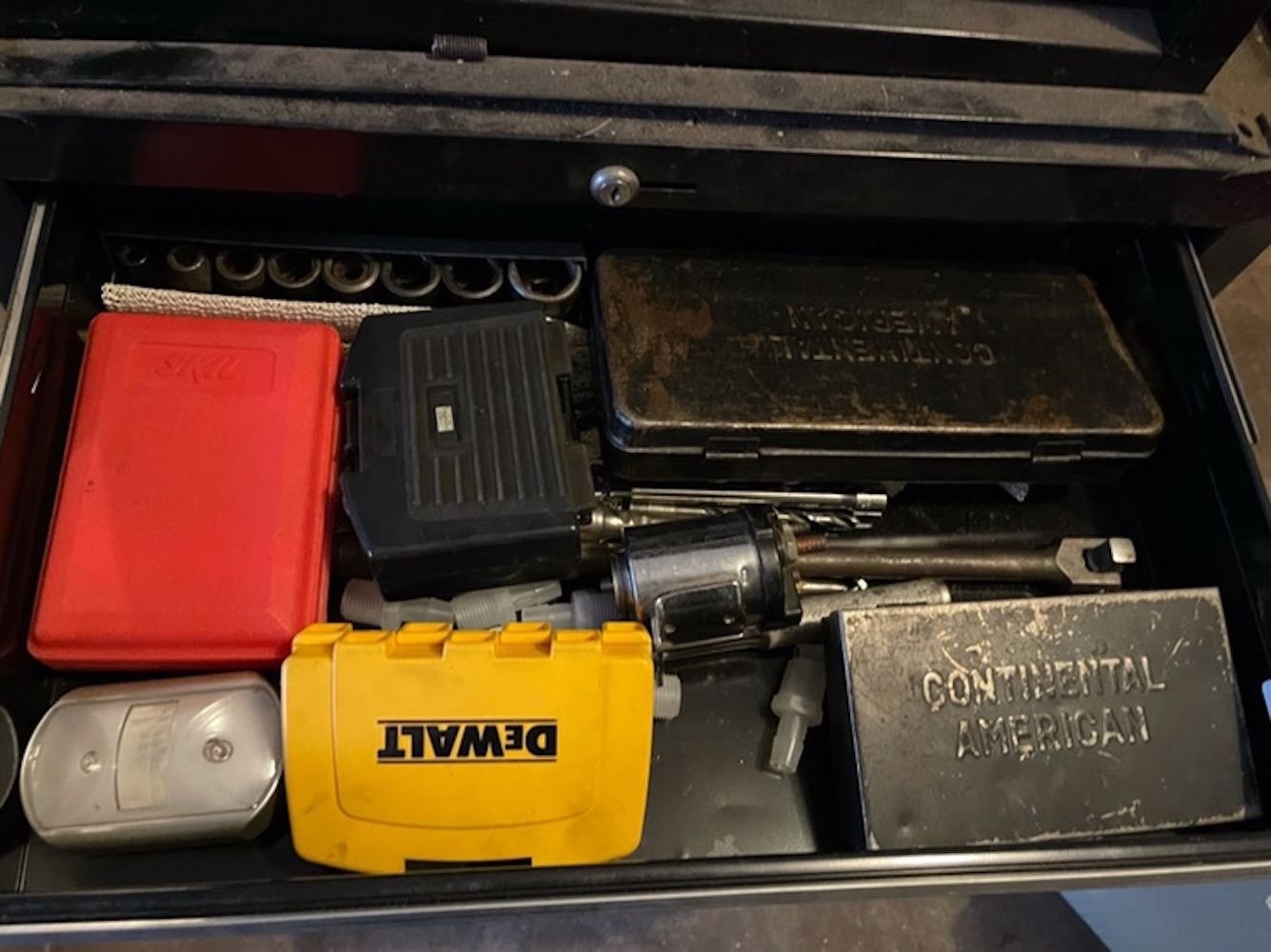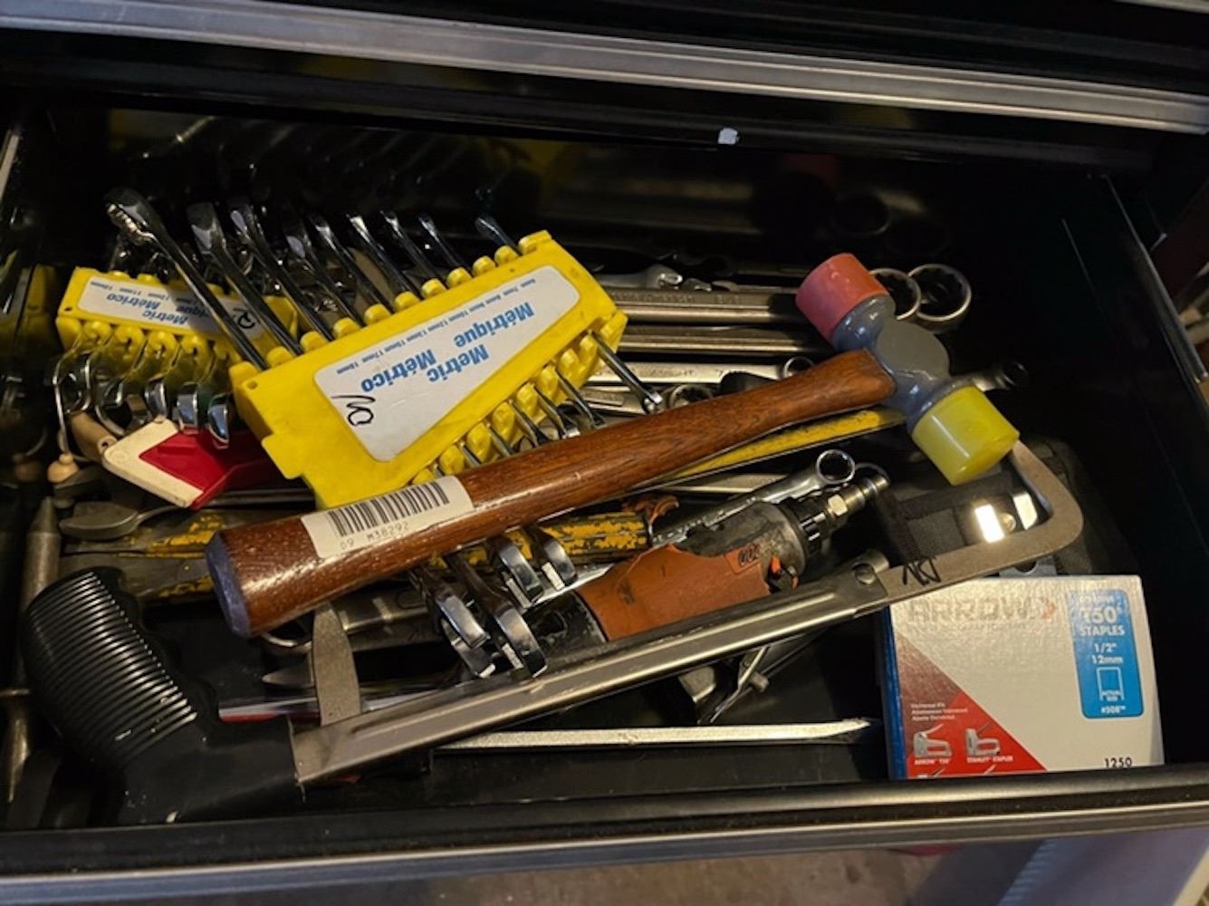 Large tool box filled, all contents included, hand tools, drill bits, etc.