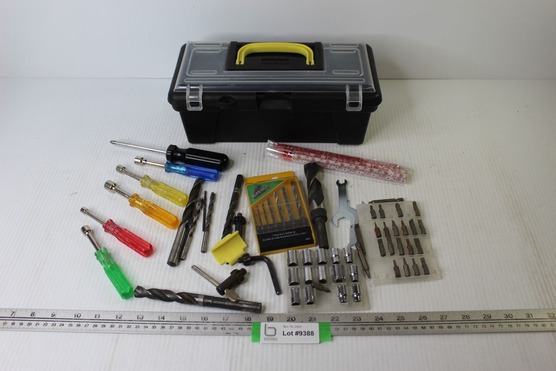 Tool Box (clasp is broken) w/Assorted Hand Tools - Drill Bits - Driver Bits - Drill Chucks - Pencils