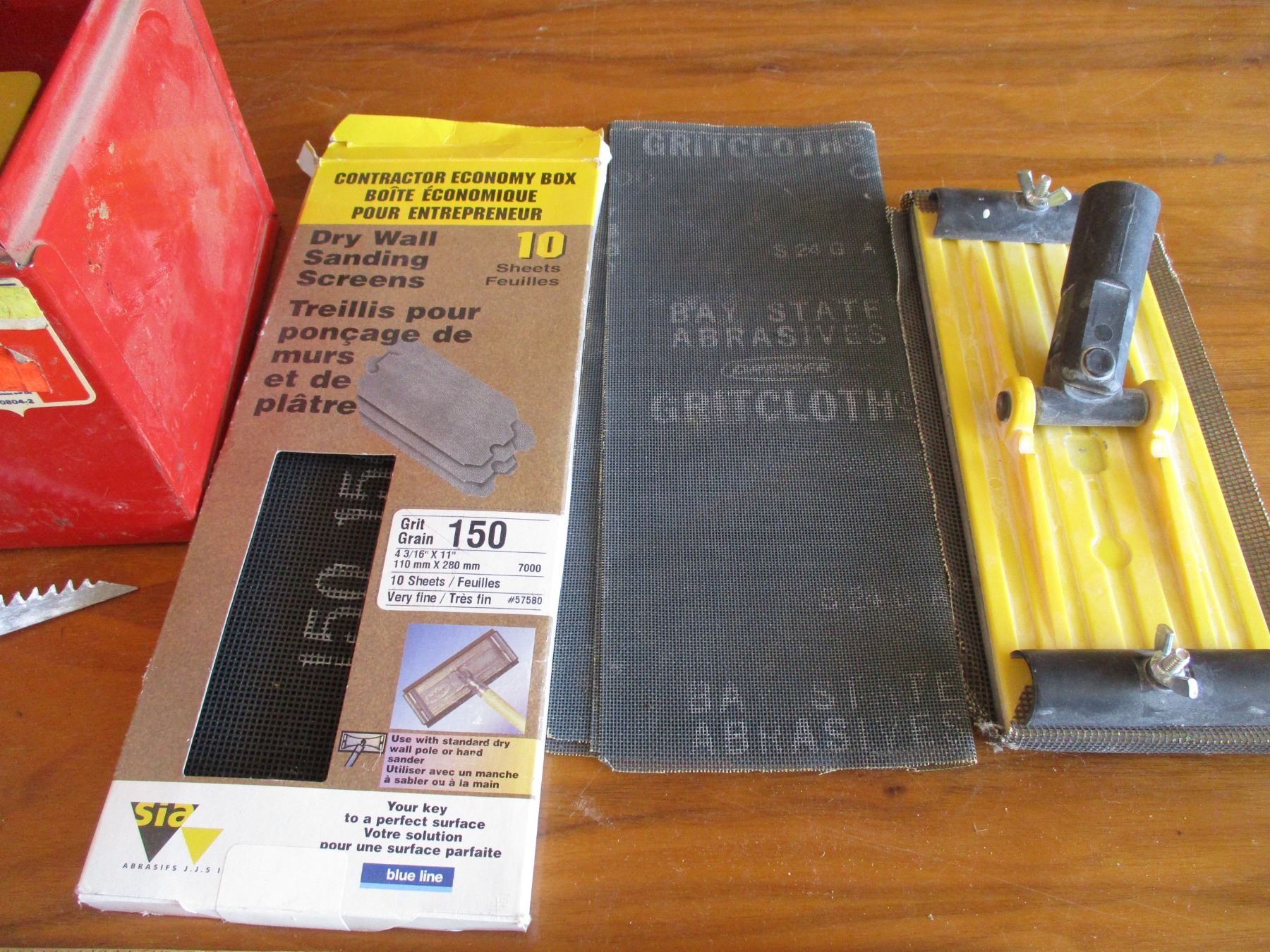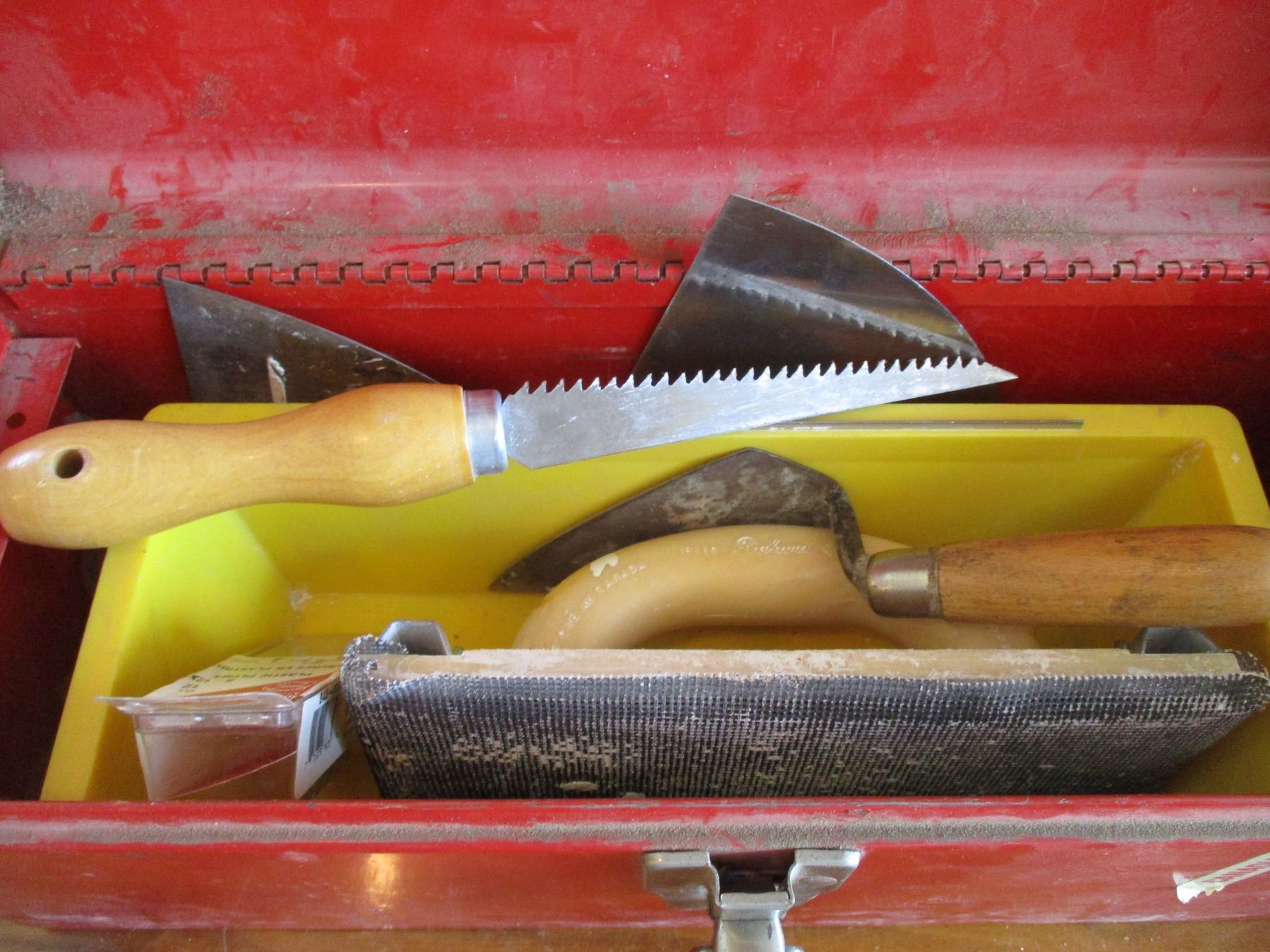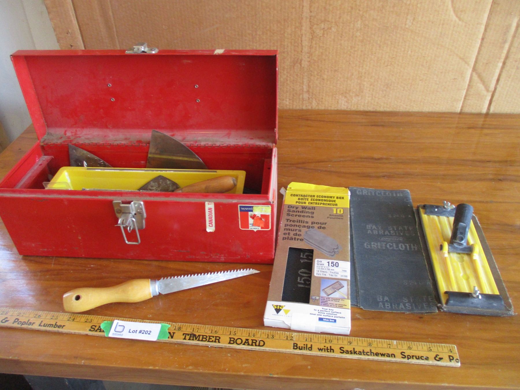 Tool Box with Drywall Related Tools (Sandpaper, Trowels Misc.)