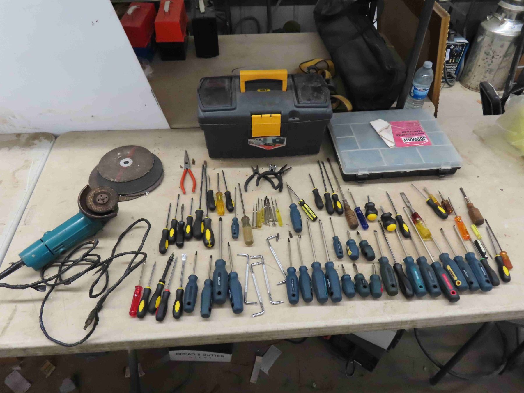 Tool Box with Screwdrivers & Pliers, Parts Organizer, Power Makita Angle Grinder (Cord is in Rough Shape)