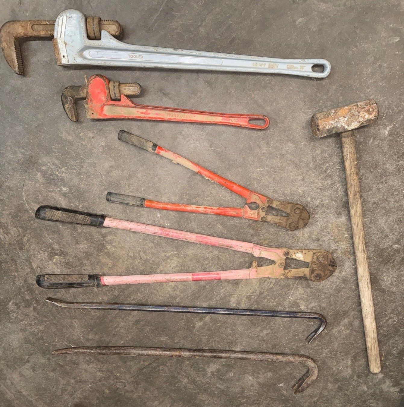 Tool Collection- Pipe Wrench, Bolt Cutters, & Crowbars