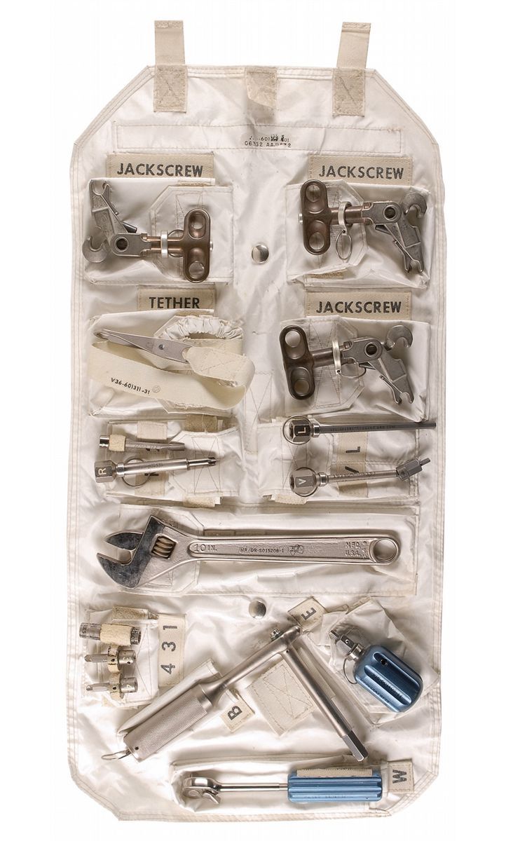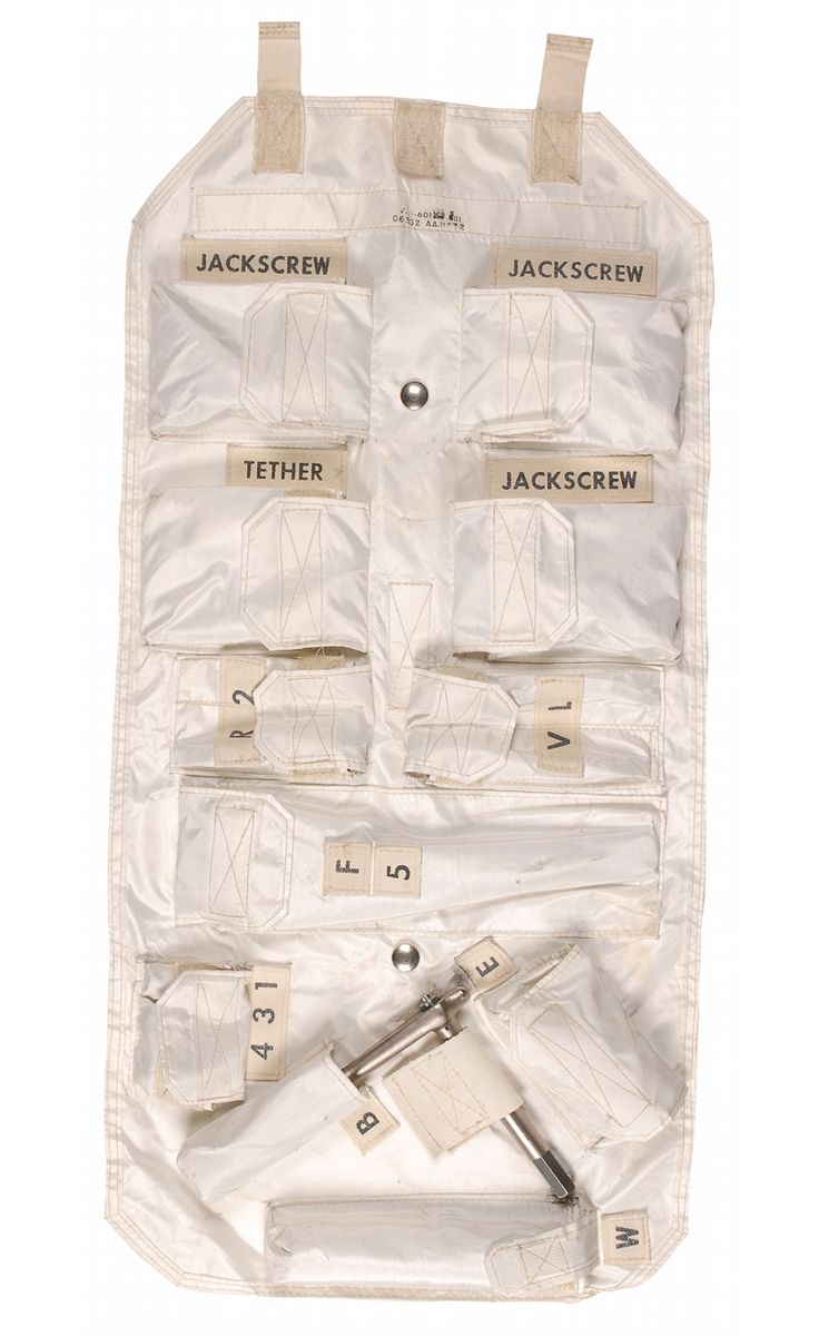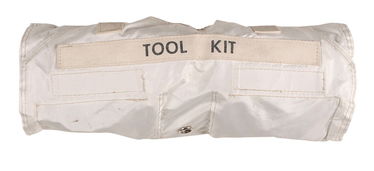Flown Apollo 17 complete tool kit carried in the command module America on the Apollo 17 lunar mission—the last lunar landing mission of the Apollo program. Sixteen-piece set consists of an adjustable open end wrench, emergency wrench, three jack screws, a 20? tether, a ‘midget’ ratchet wrench, an adapter handle, and eight various flathead, Philips, and socket drivers. Entire kit is housed in its original Beta cloth pouch, serial #V36-601135-501, in their respectively labeled Velcro closing pocket. Kit measures 12 x 25.25 when unrolled. When rolled, the kit seals with three Velcro tabs at the top and has a patch identifying it as “Tool Kit.” Each tool has a tether ring and is designated with a heavy stock card NASA-MSC System and Component Historical Records, each piece’s history from being flown on the Apollo 17 Command Module, with a flight duration of 304 hours, 44 minutes, and 20 seconds, and its release from bonded storage. Entire kit is also accompanied by a Space Division, North American Rockwell Corporation temporary parts removal tag. In addition, each tool has its own serial numbers. This kit was located in the CM in locker A-8, and was listed on the official mission stowage list as being the only one aboard. Complete, intact artifact sets of this kind with such detailed records for each individual piece are exceedingly rare and in very high demand.