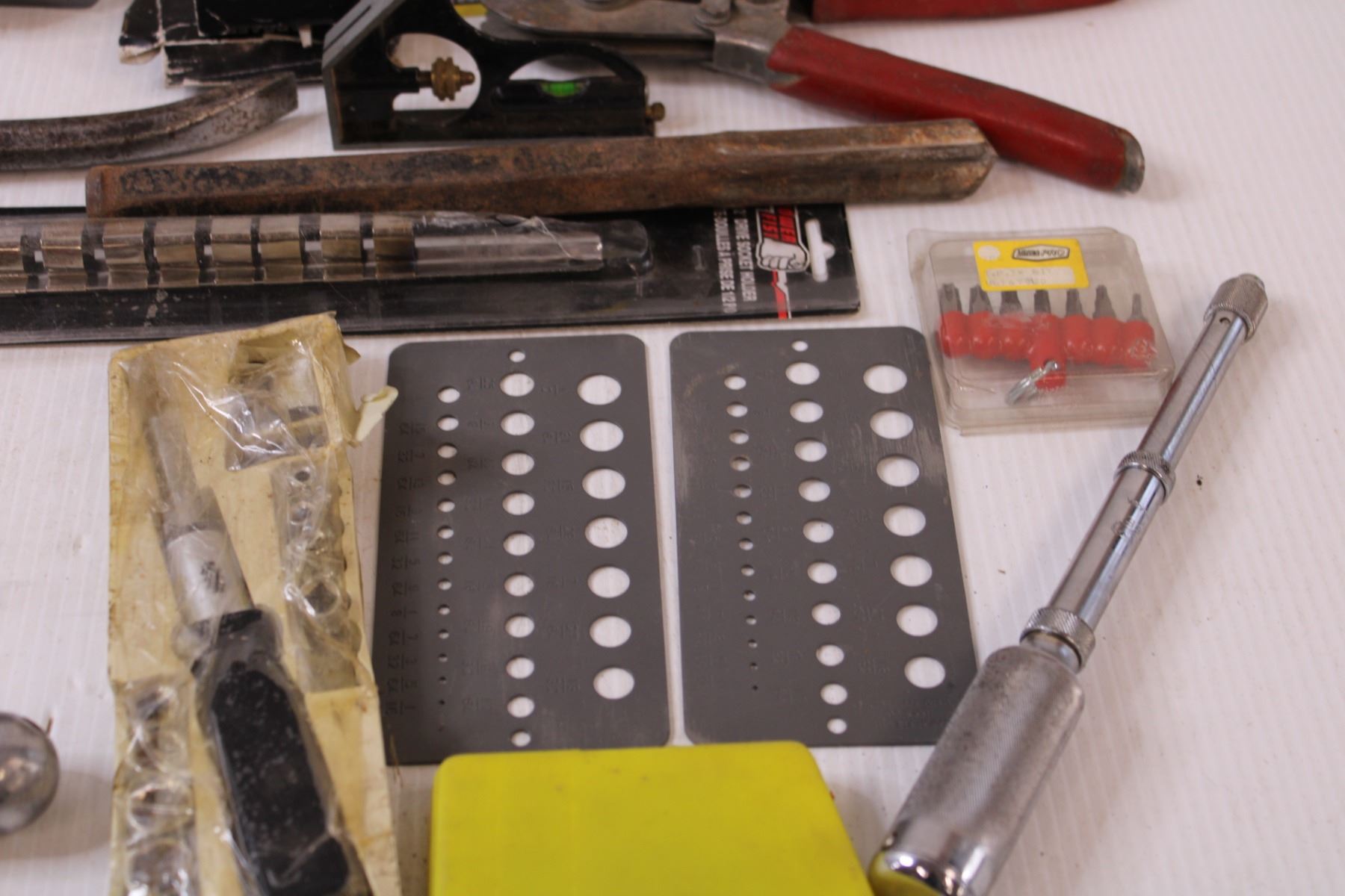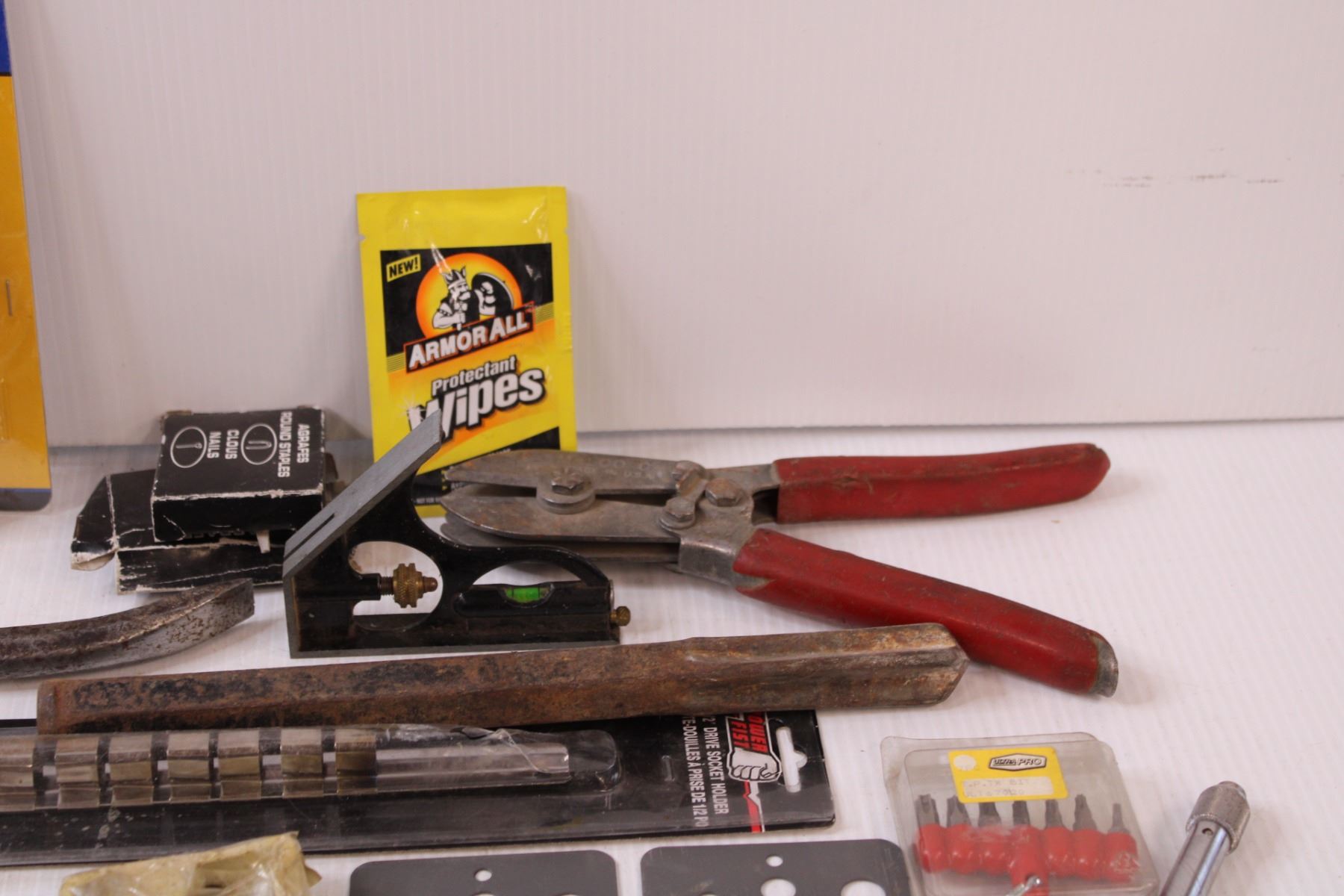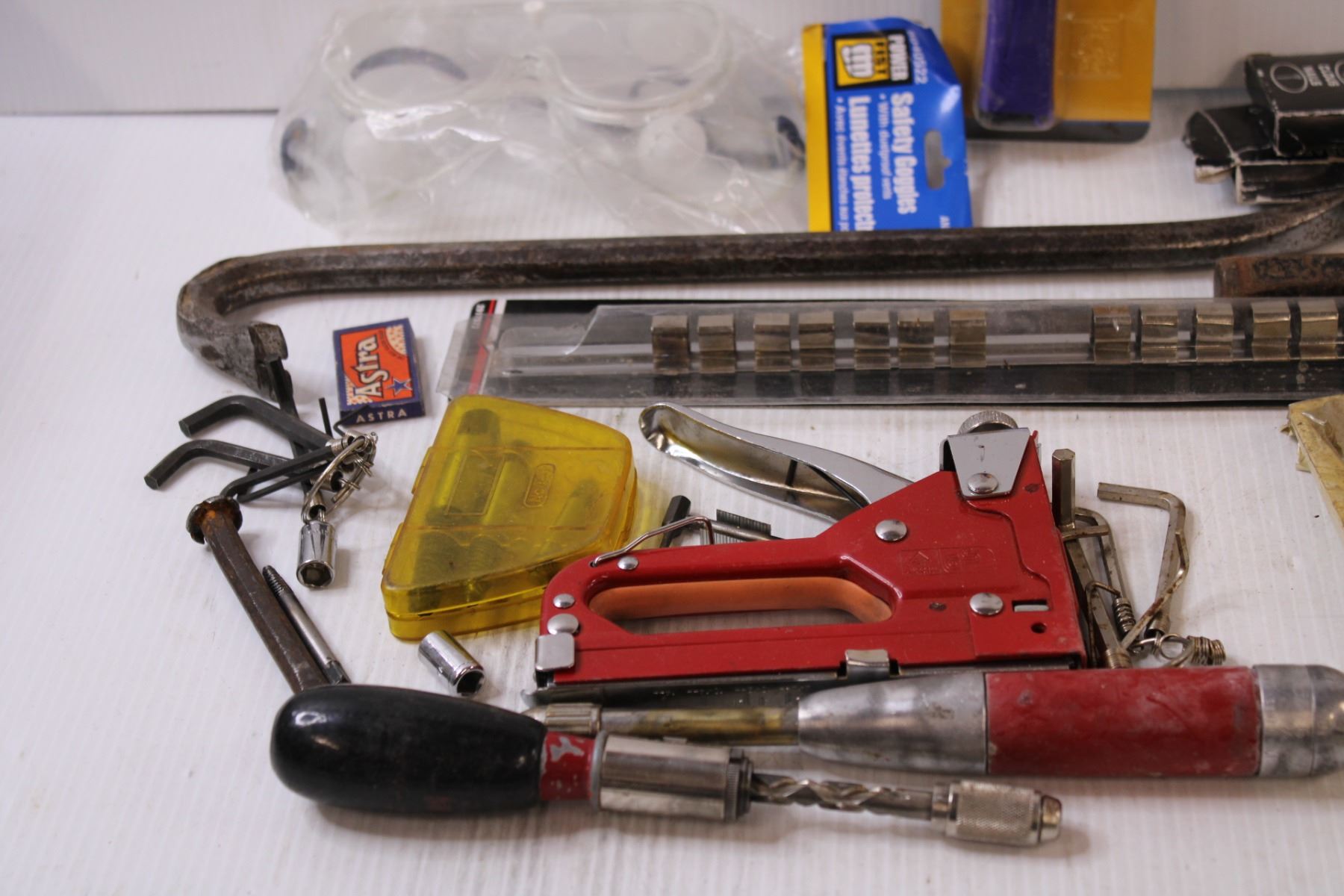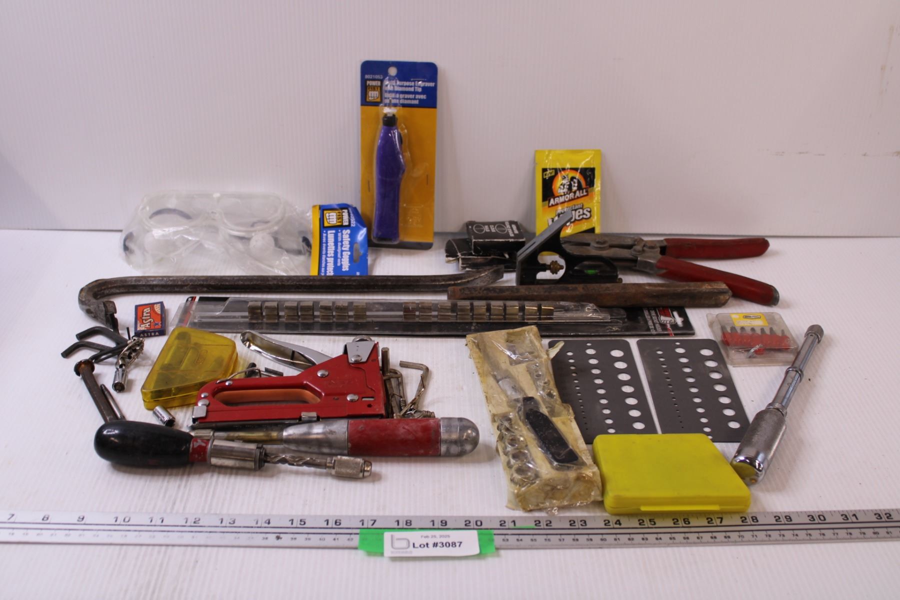 Tool Lot: 1/2" Socket Set Holder, Safety Goggles, Hand Drill Screwdrivers, Hex/Allen Keys, Misc