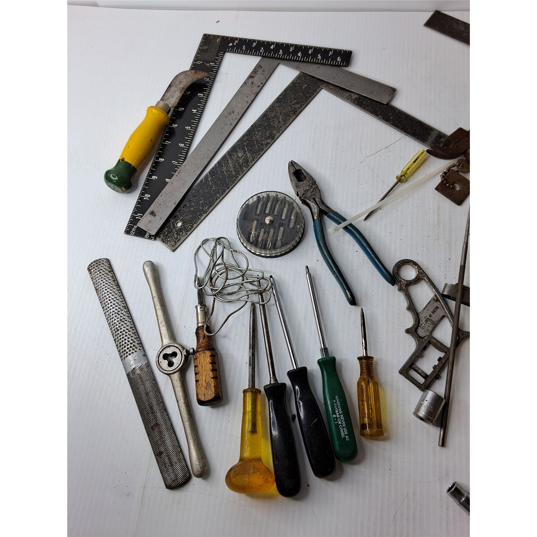 Tool Lot- (4) Squares, Screwdrivers, File, Misc.