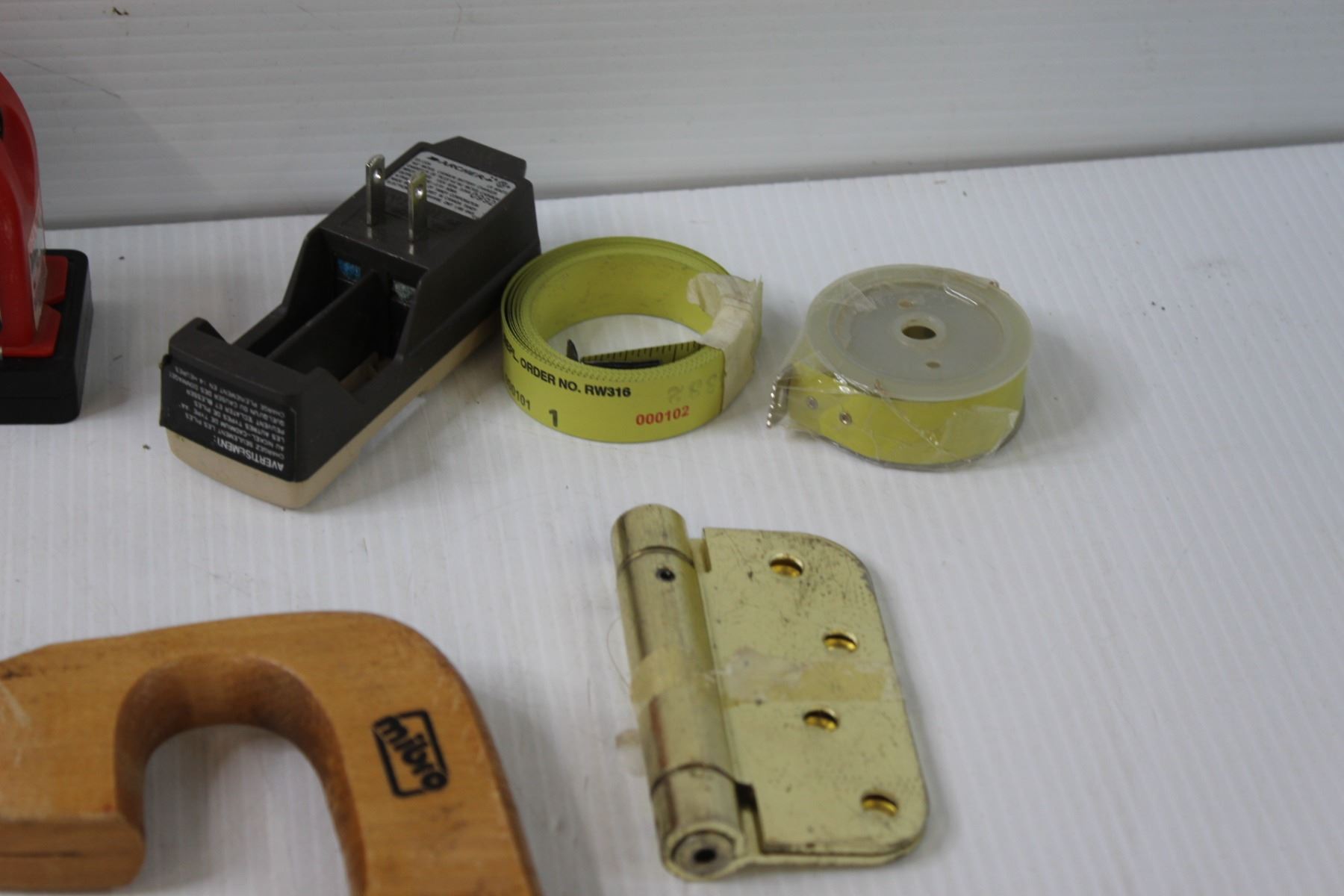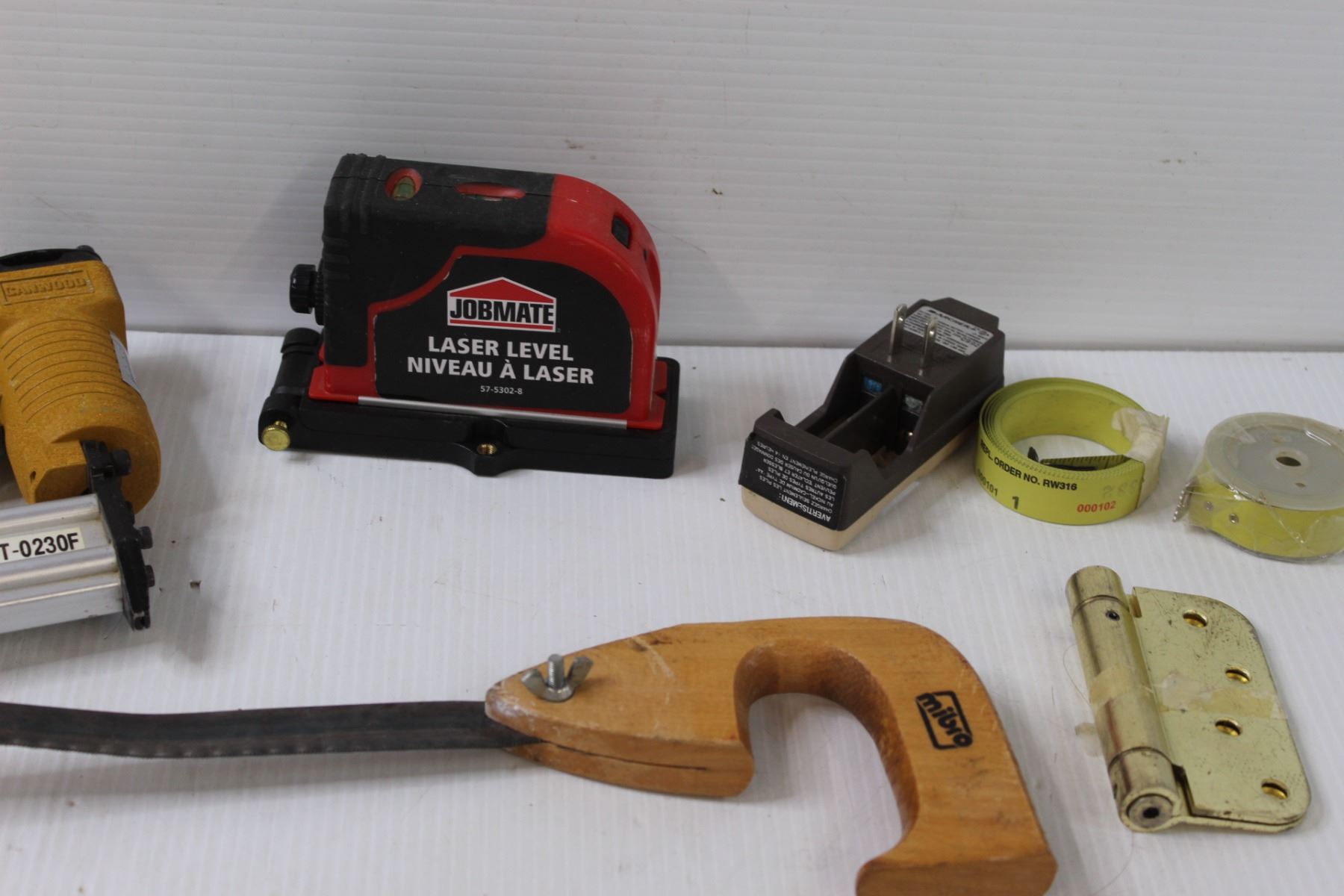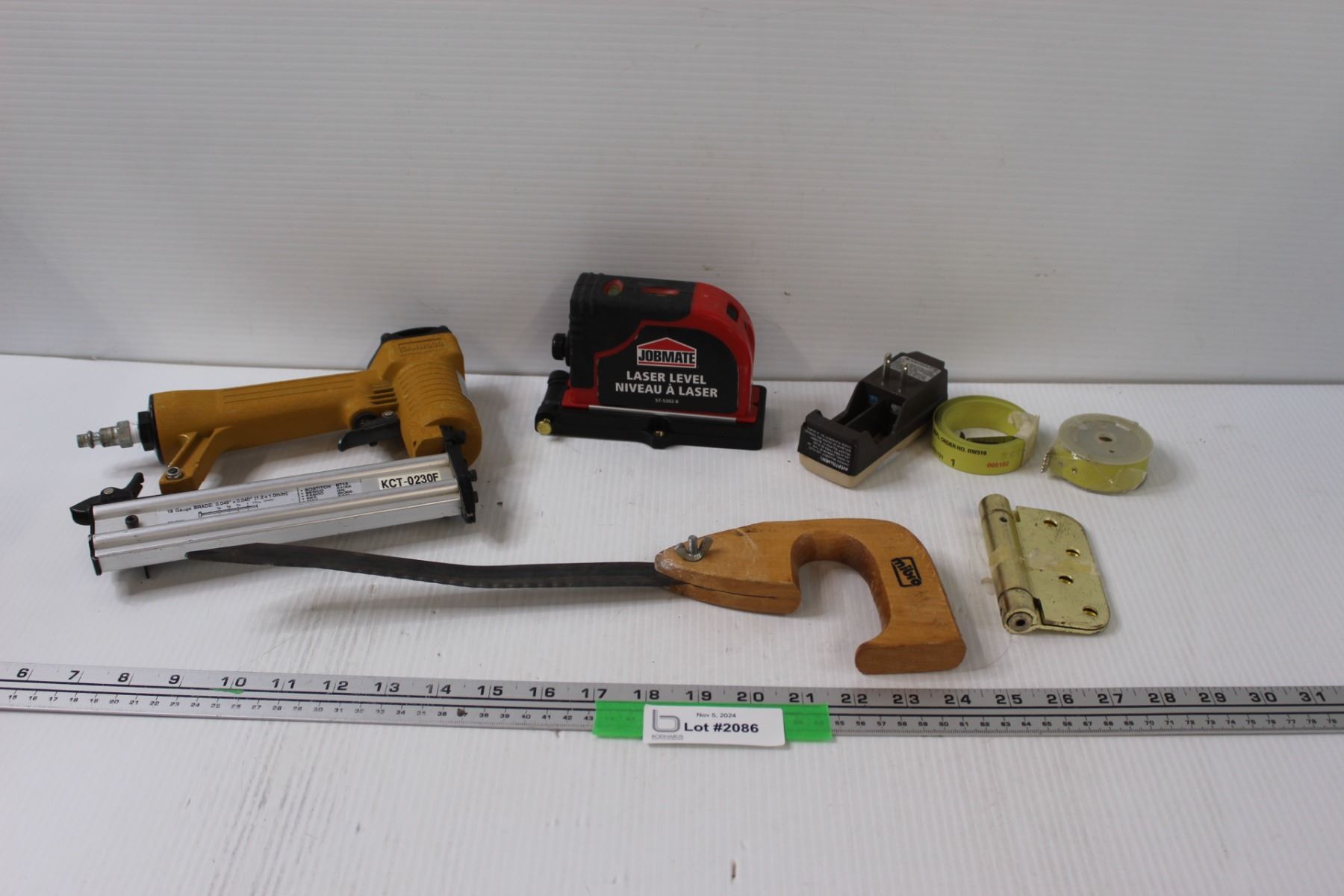 Tool Lot: Air Staple Gun, Laser Level, Hand Saw, (2) Measuring Tape Replacements Rolls, Hinge