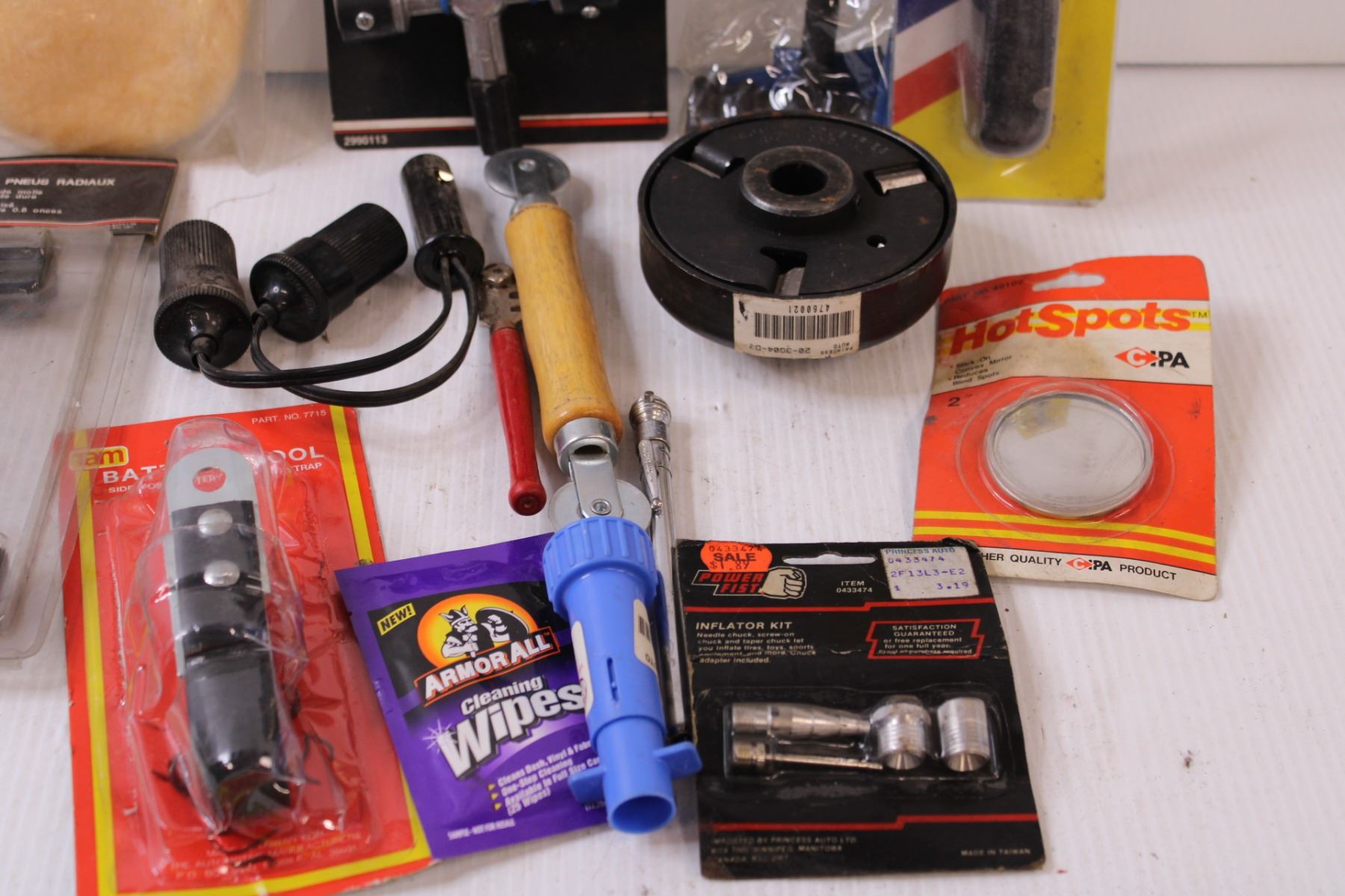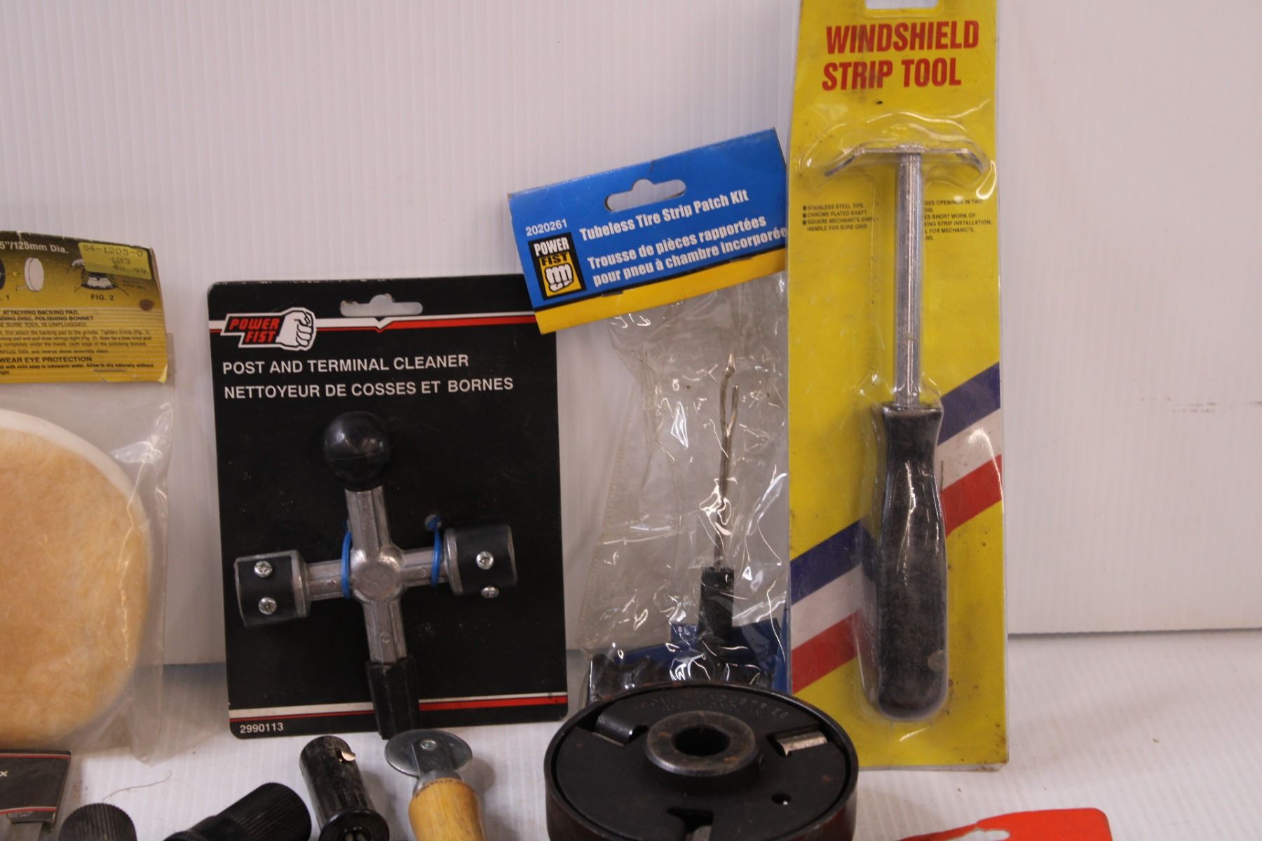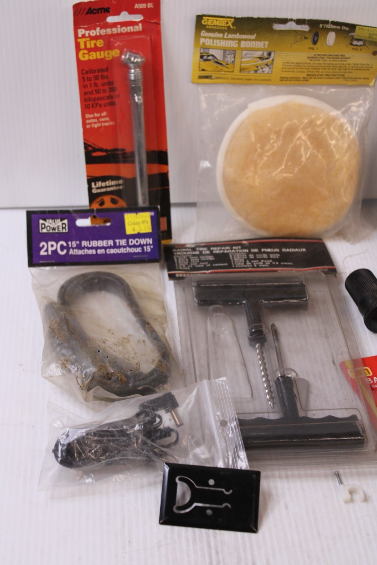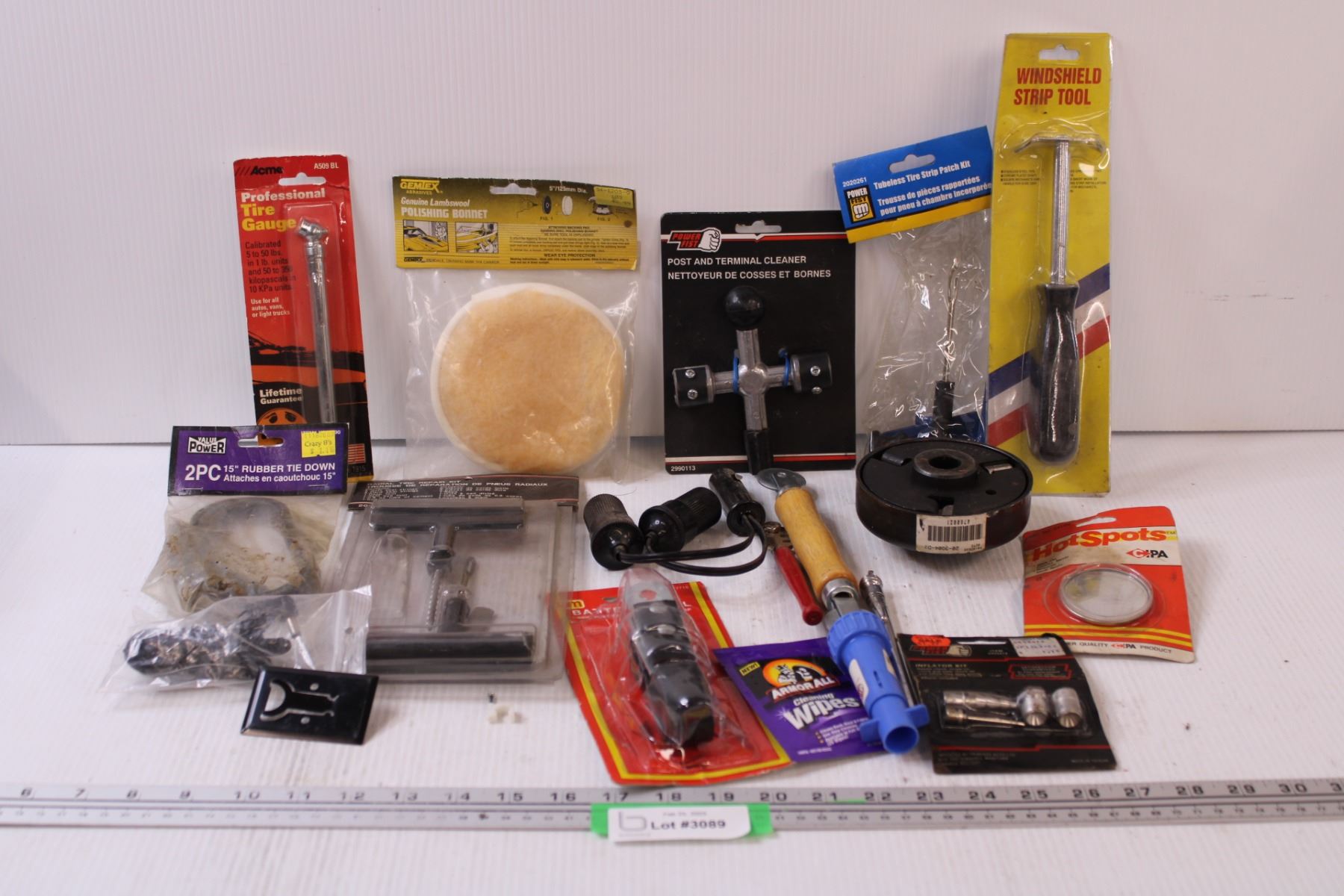 Tool Lot: Battery Terminal Cleaner, Tire Repair Kit, Tire Gauge, Windshield Strip Tool, Misc
