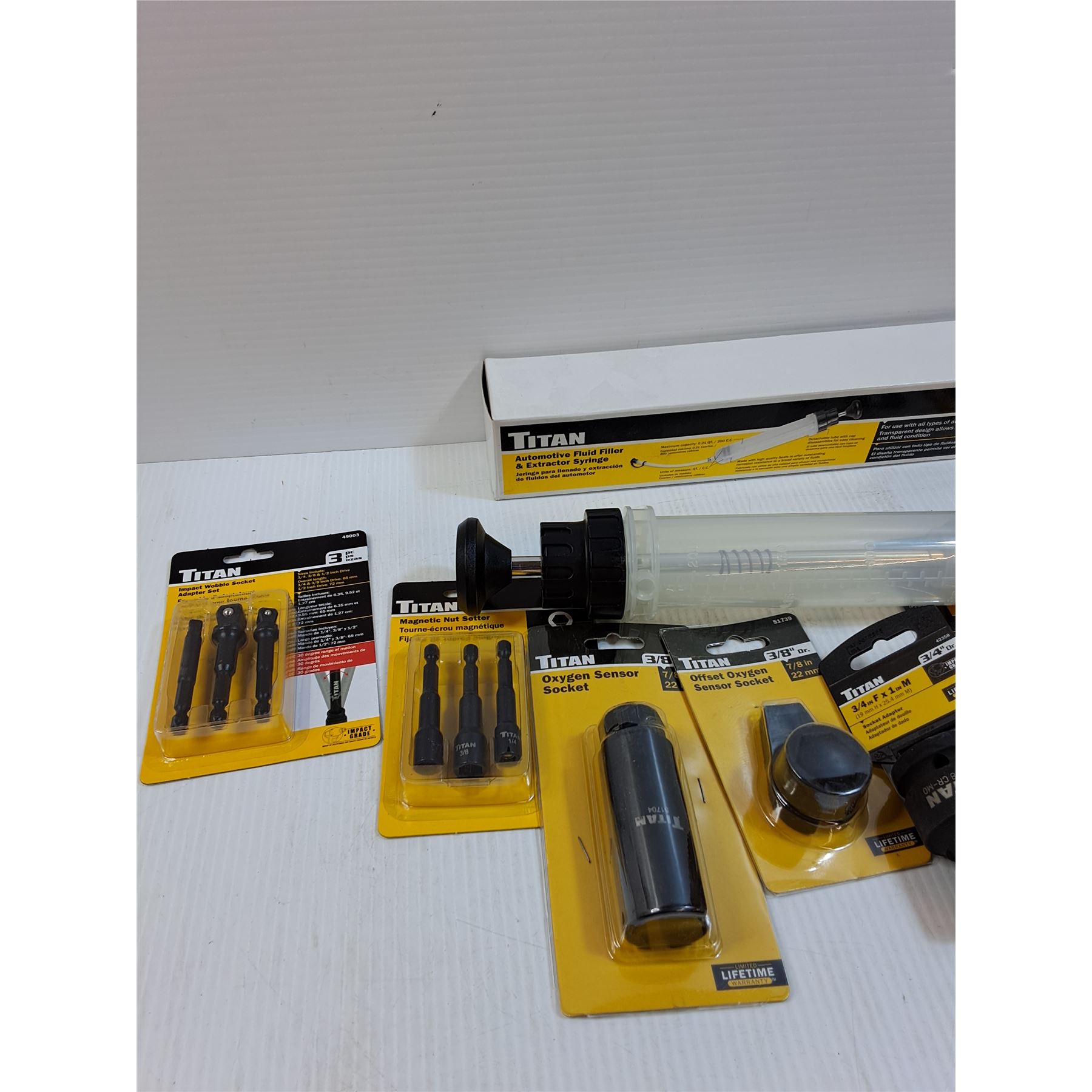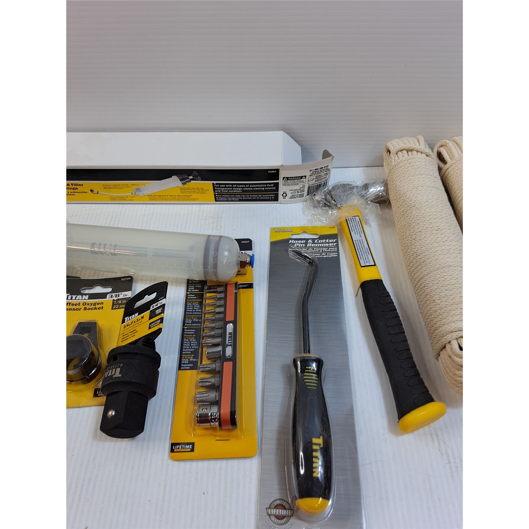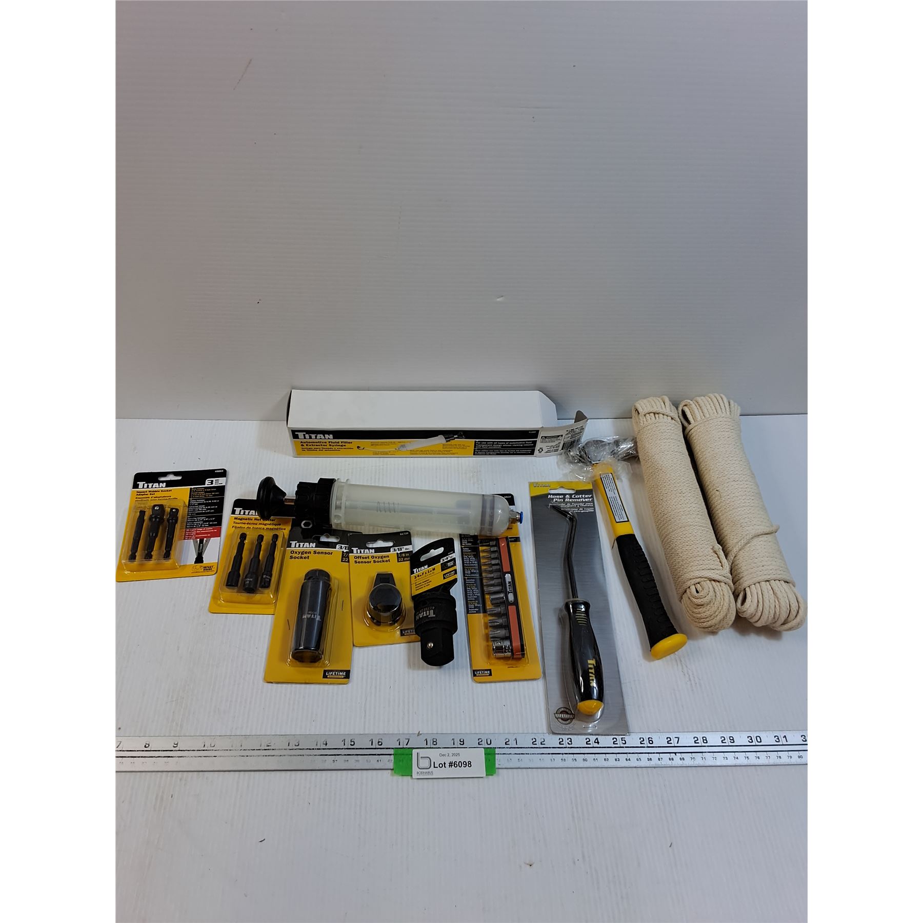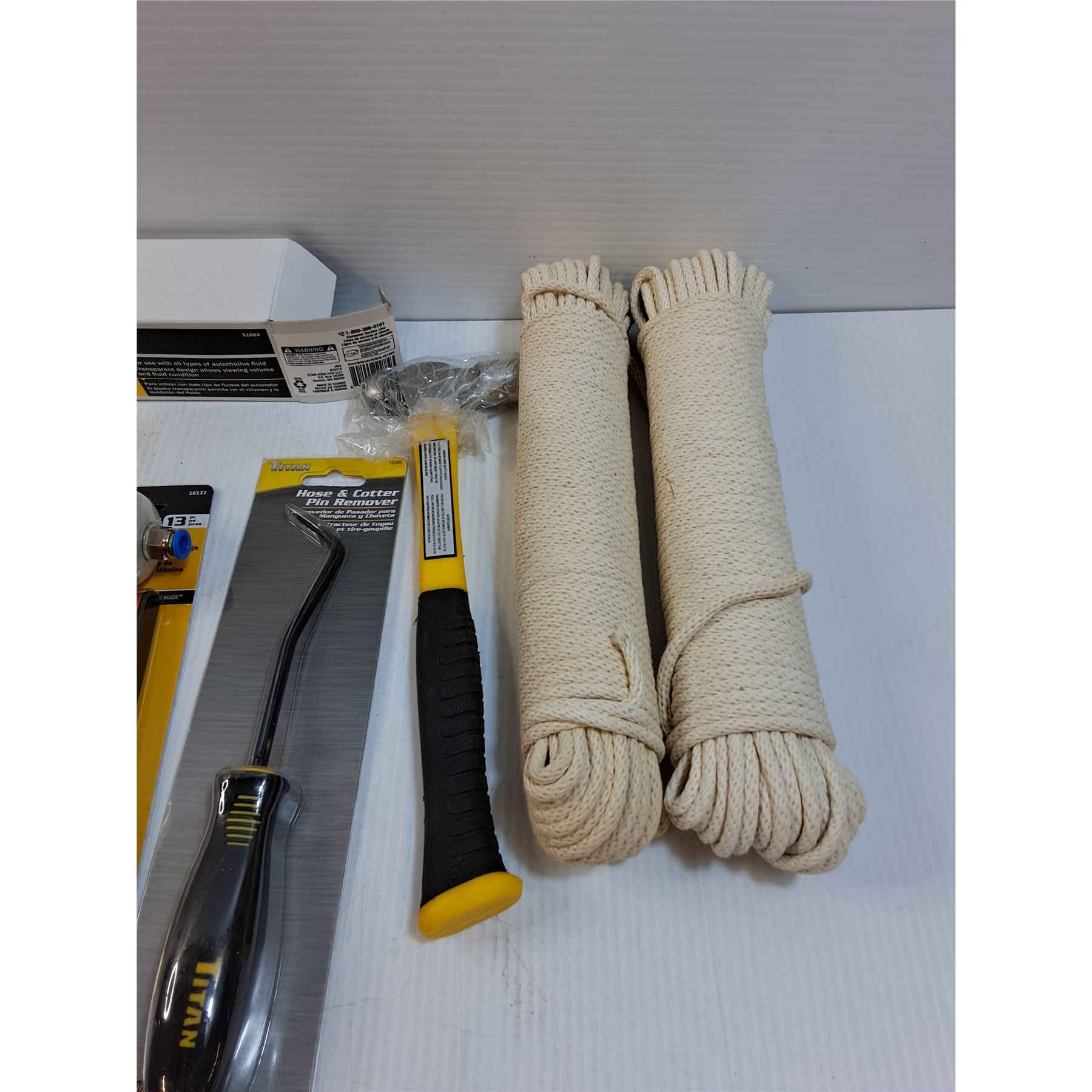 Tool Lot: Fluid Filler/Extractor, Rope, Hammer, Sockets, Misc