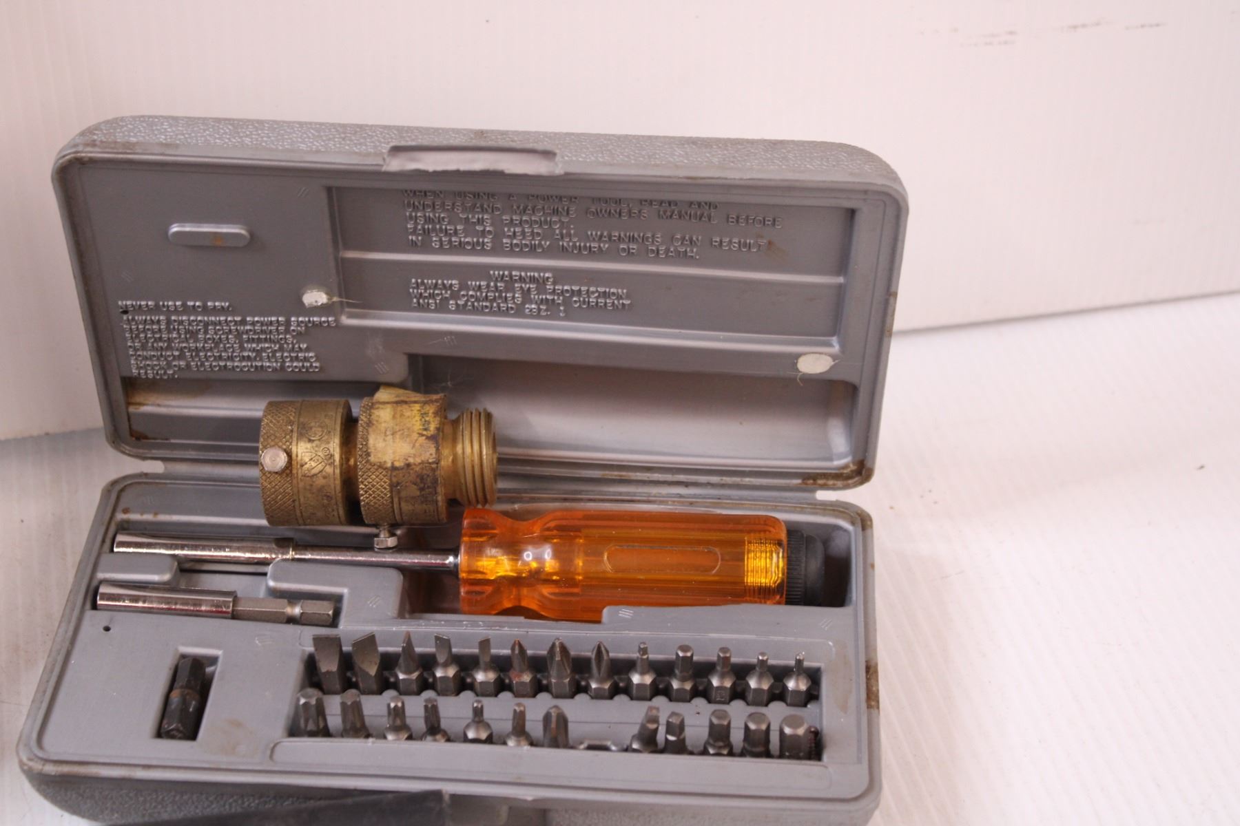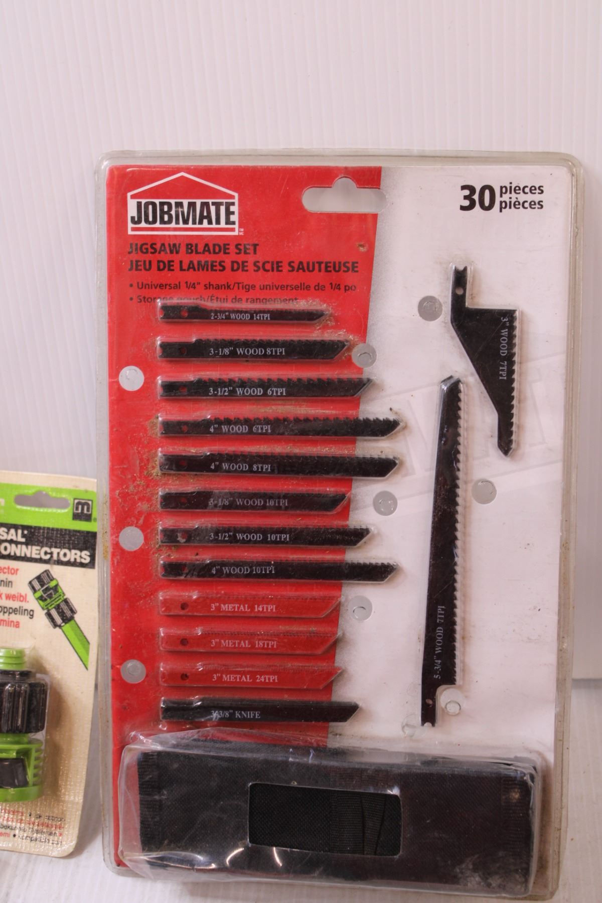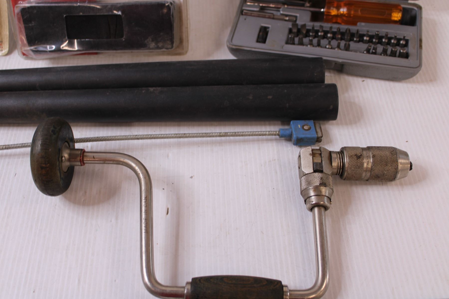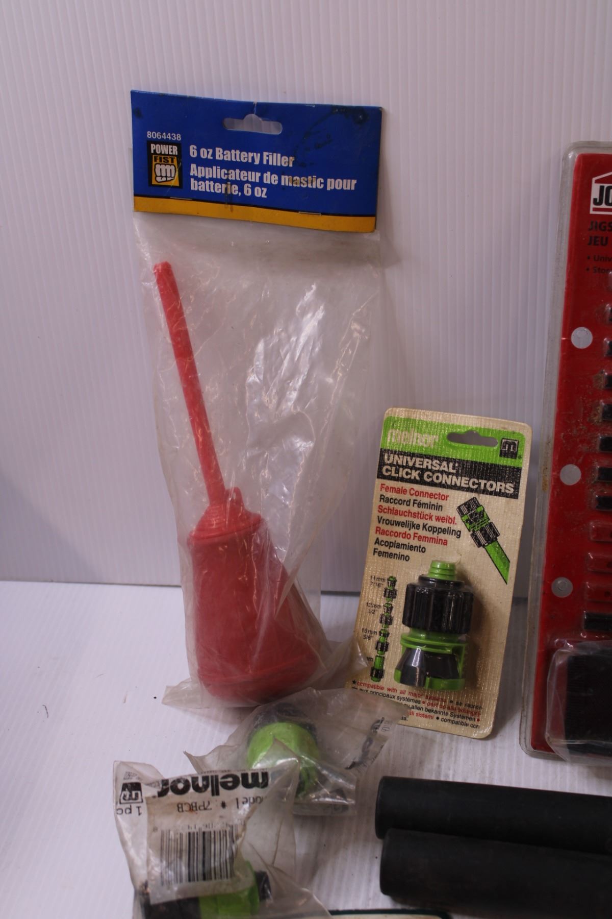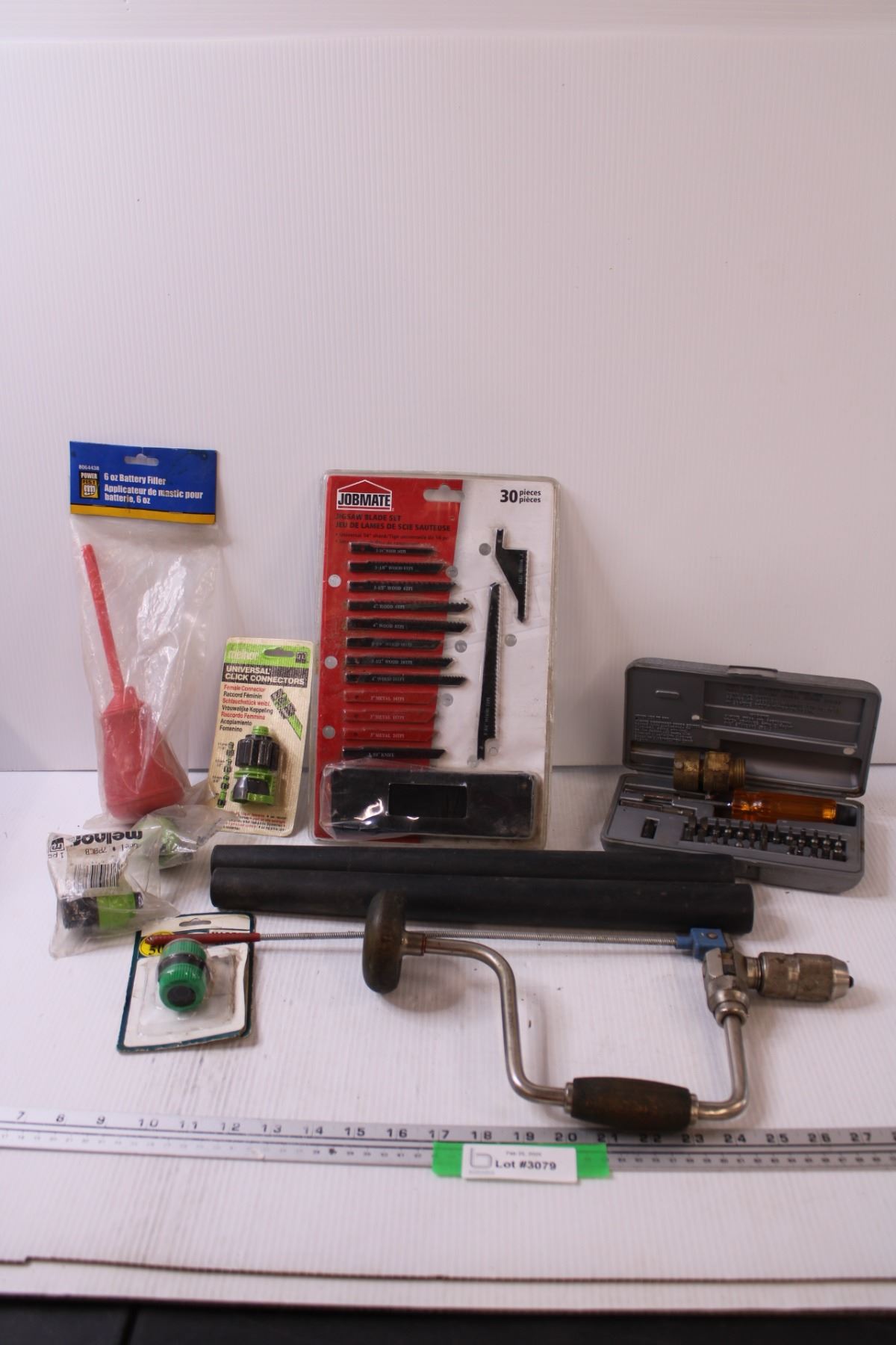 Tool Lot: Hand Drill, Jigsaw Blade Set - NOS, Screwdriver Set, Hose Connectors, Battery Filler, Misc
