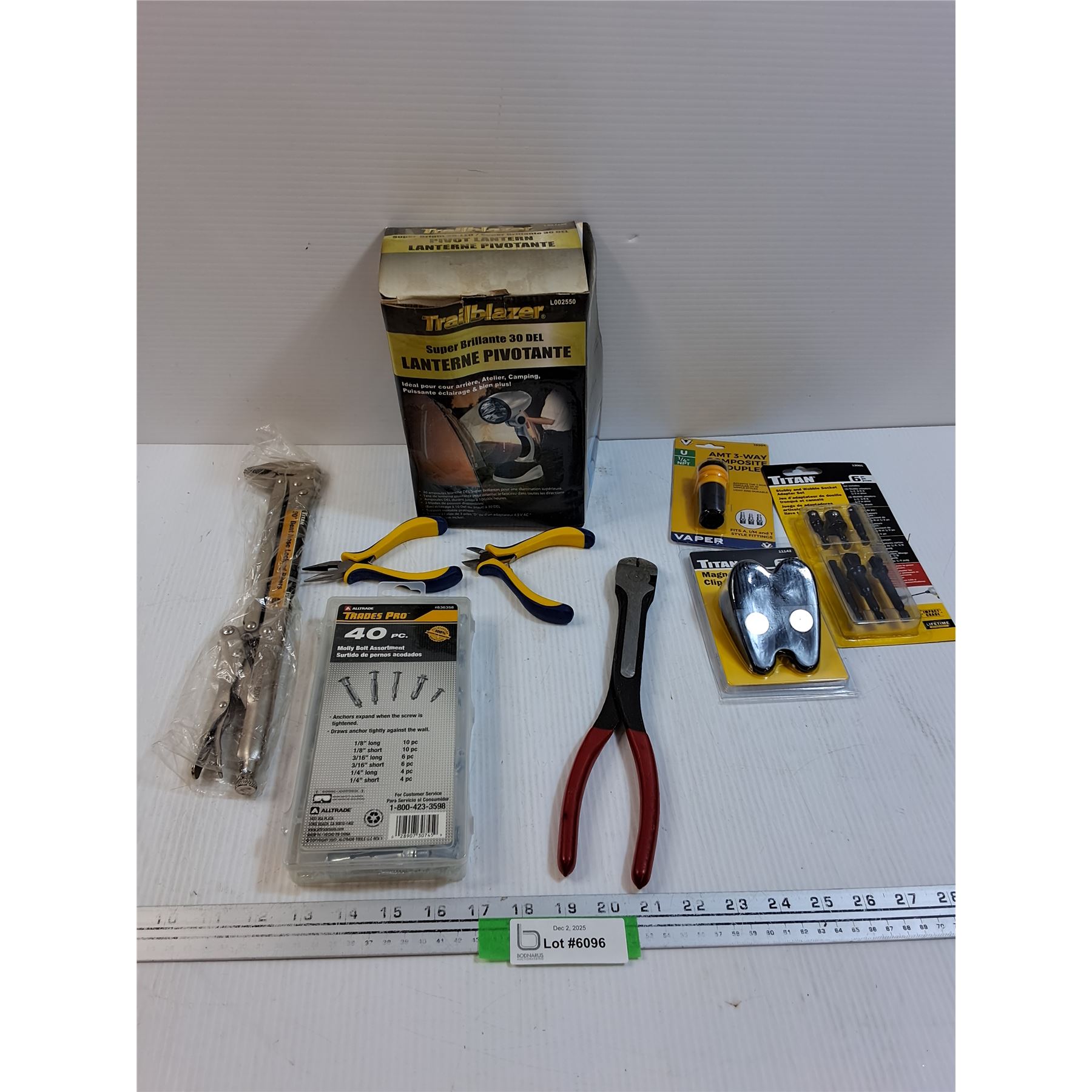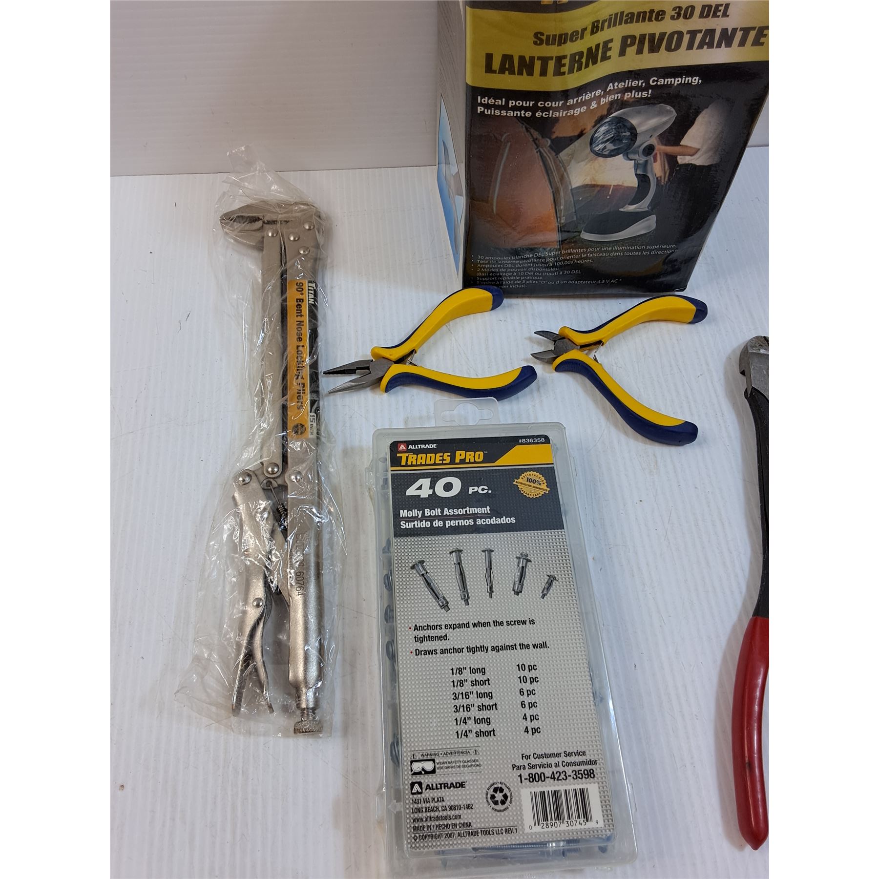 Tool Lot: Wire Cutter Pilers, Molly Bolt Set, Locking Pilers, Flashlight, Misc