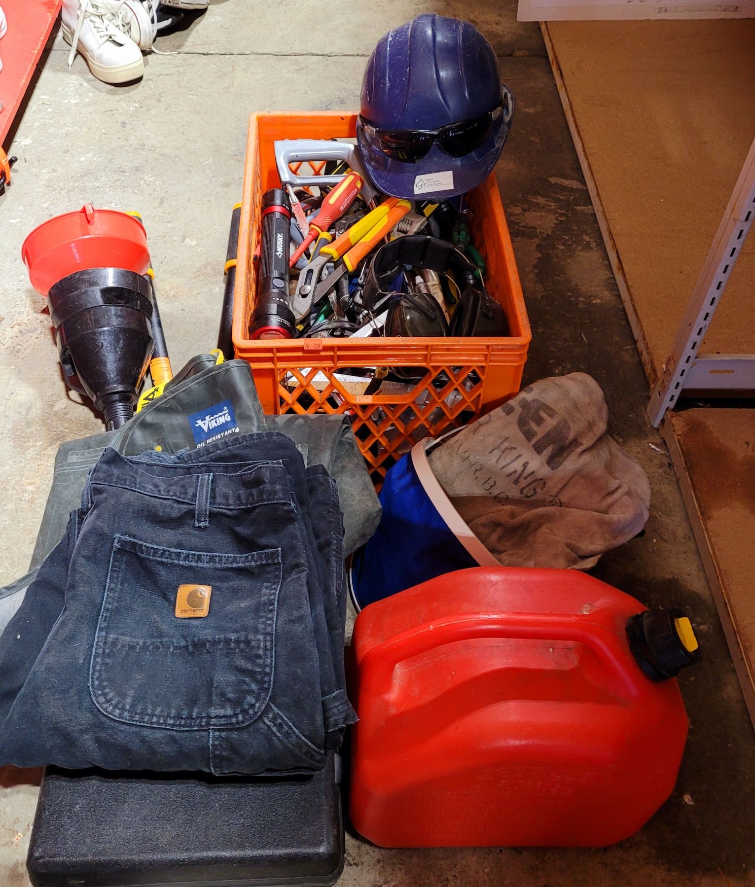Tool & Work Lot w/ Carhartt Work Pants, Hard Hat, Slip-Joint Pliers, Husky Flashlight, & More