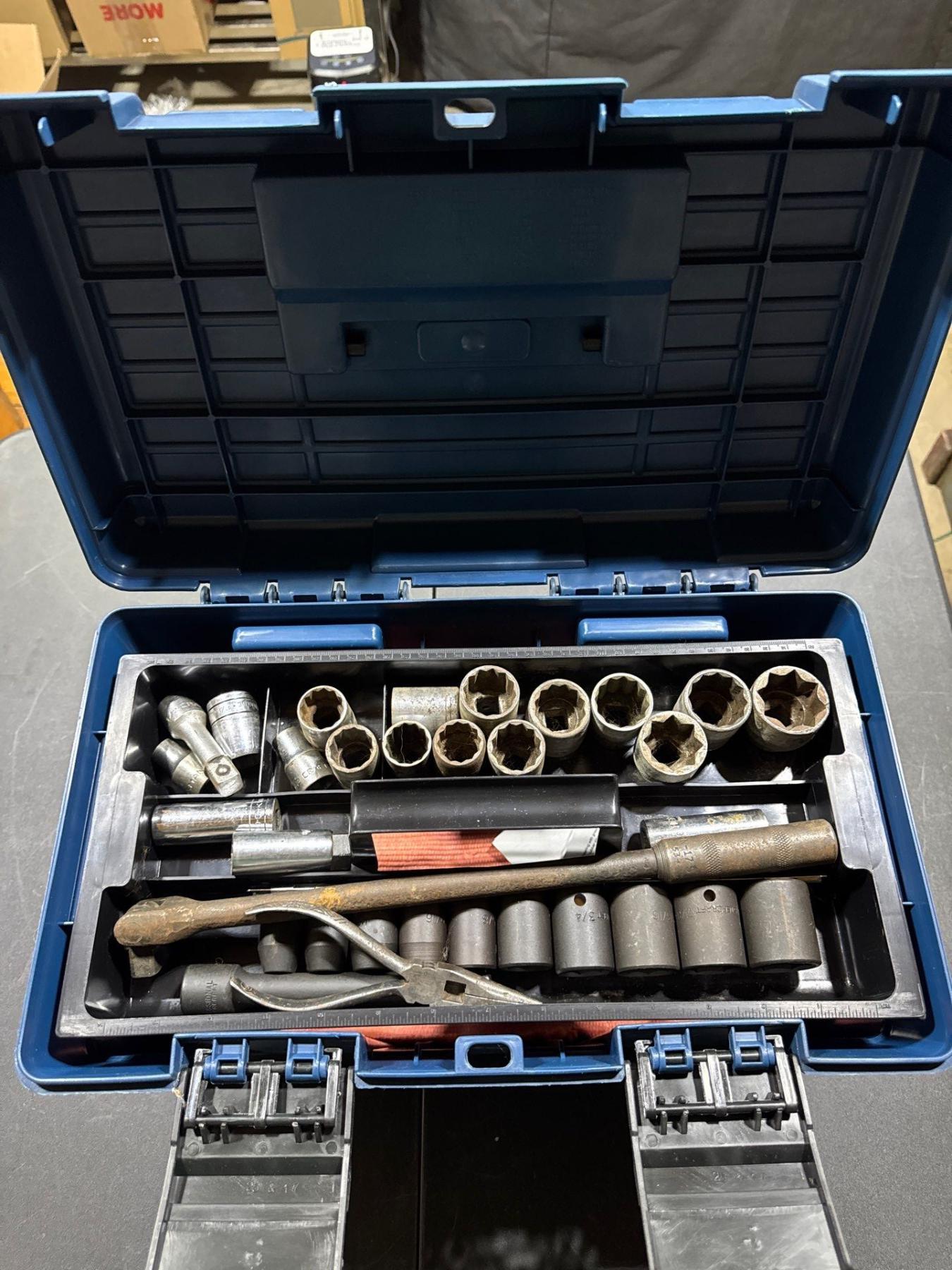 Toolbox with breaker bar, impact sockets, all contents included. MasterCraft toolbox