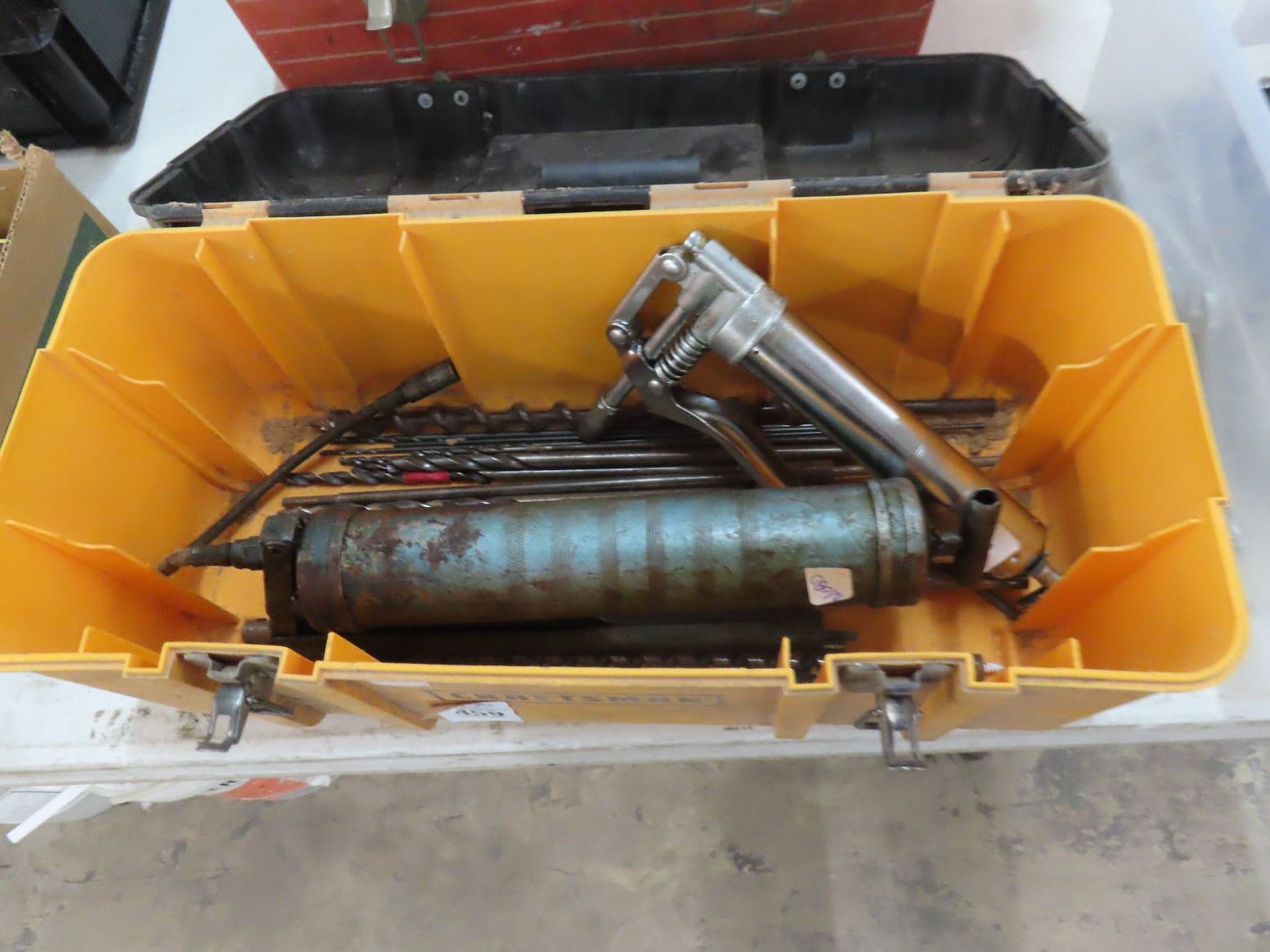 Toolboxes w/Grease Guns, Long Drill Bits, Paints, Dryer
