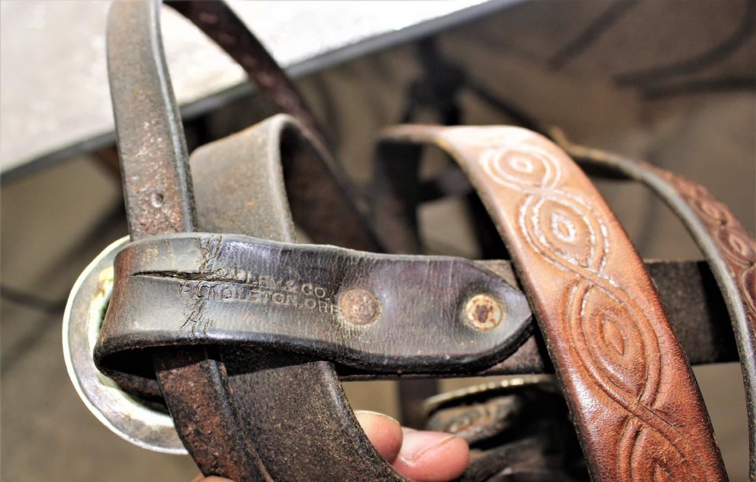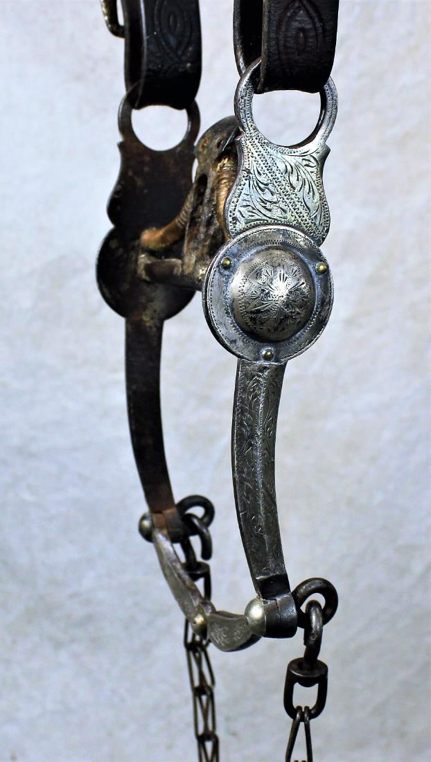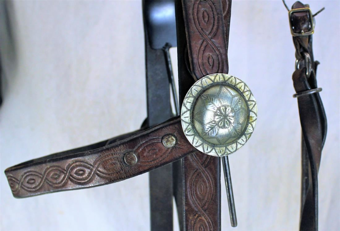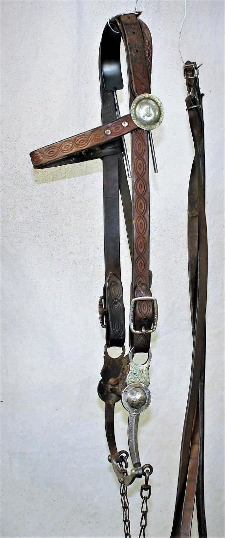 Fully tooled light colored headstall set off by maker marked Morales spade bit and engraved conchos.