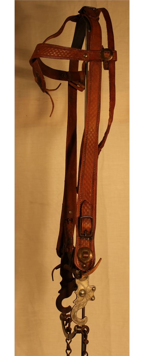 Headstall with Prison Style Bit, attractive basketstamped headstall with a stylish fully silver overlaid halfbreed bit, in unused condition.