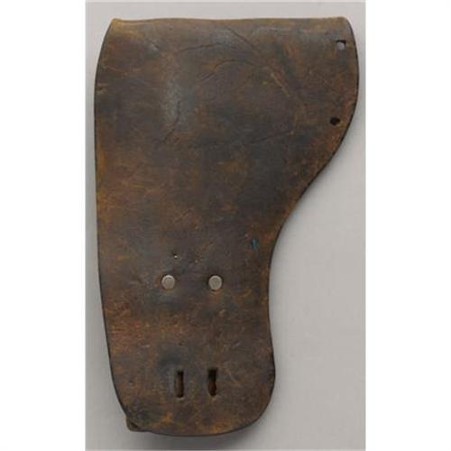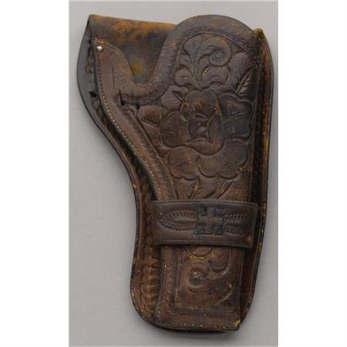 <B>TOOLED HOSTER</B></I> - Single loop, fancy tooled, square bottom, untrimmed holster that fits a short barrel Colt Bisley revolver.<BR><BR><B>Condition:</B></I>Soft and pliable. Cross shape pattern added to center of holster loop tooling. Two small holes in holster body near triggergurad could of originally been for a thong to secure the revolver hammer.<BR><BR><b>Shipping:</b> Miscellaneous Collectibles, Smal (<a target="_blank" href="http://www.heritageauctions.com/common/shipping.php">view shipping information</a>)
