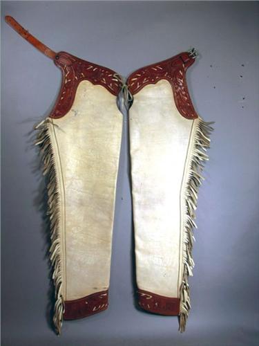 Tooled Leather Cowboy Chaps, unmarked with LN monogram, brown and white leather. Very good condition. 41 inches long.