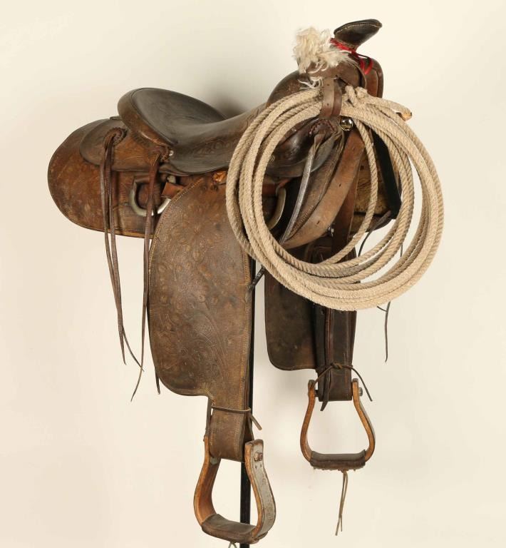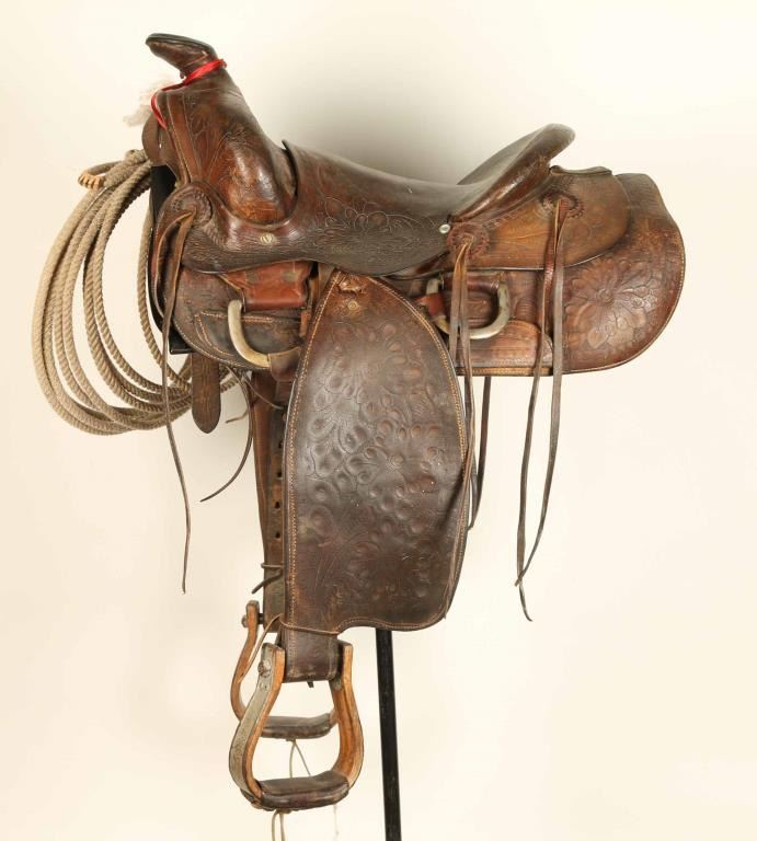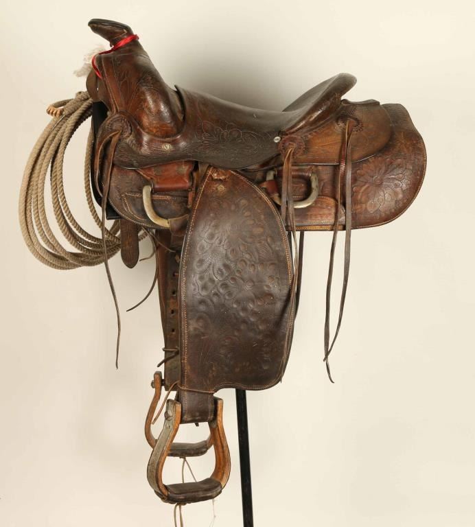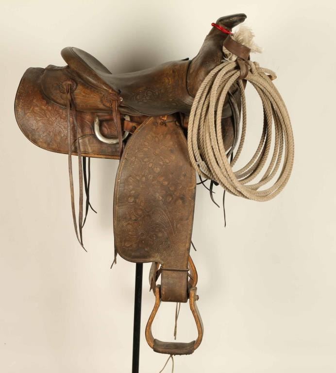 This beautiful unmarked saddle has a tooled floral motif, tapaderos to match, and is decorated with a lasso and bells. Has a 15" seat.