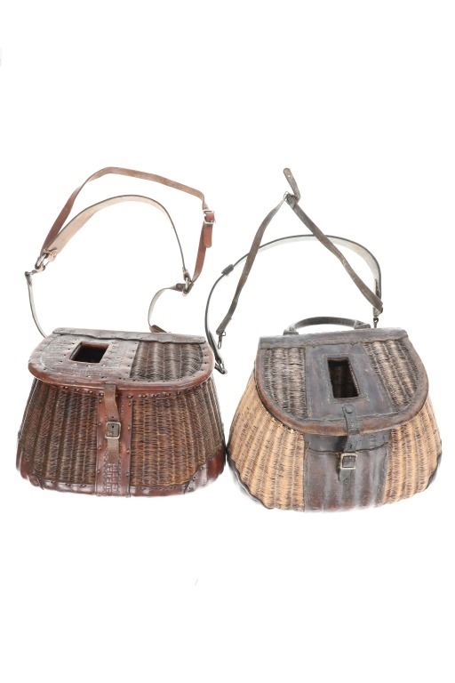 For your consideration are two tooled leather and split willow fishing creels from the early to mid 20th century. These creels resemble the style and looks of two major creel makers, W.H. McMonies and George Lawrence Company, but are unmarked. The first and darker colored creel shows a tooled leather & split willow construction. It features a leather shoulder strap for easy carrying. The split willow construction shows a nice, tight weave. The lid is secured by a leather and metal buckle on the front. The lighter colored creel shows an identical style but features the fish hole in the center of the lid rather than the left side. It also features a shoulder strap but since been broken on one side. They show good condition overall with wear present from their age and use over the years, but no major signs of damage is noted. They measure from 7 5/8" L x 16 1/8" W x 10 5/8" H to 8 1/2" L x 16 5/8" W x 10 1/8" H. they have a collective weight of 7 pounds and 4 ounces.