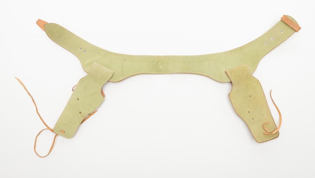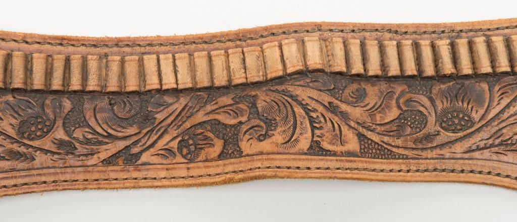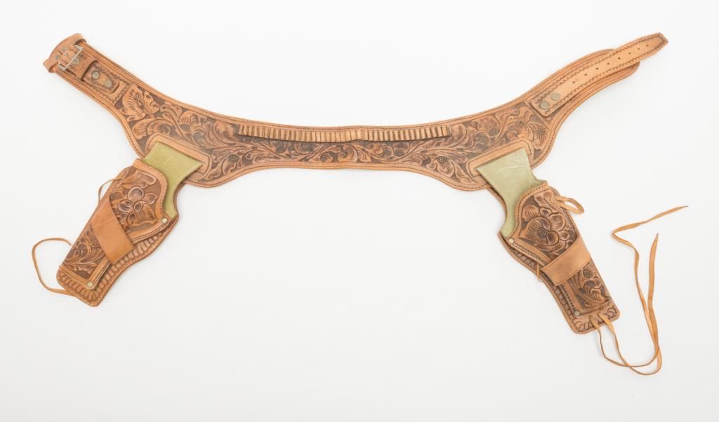 Tooled leather double holster rig, unmarked, for Single Action revolvers, in very good condition with lined holster interiors and matching lining to back of gun belt. Est.: $150-$300.