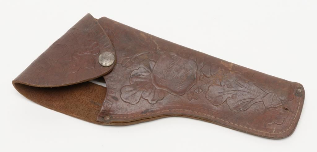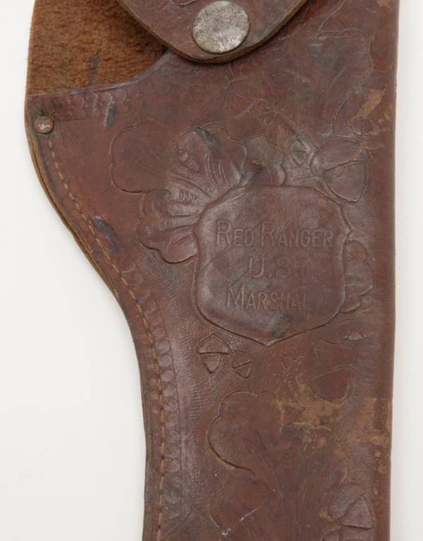 Tooled leather flap holster marked “Red Ranger U. S Marshal”, in overall good condition; if you have the old cap gun for this; you can’t be without this holster! Est.: $50-$75.