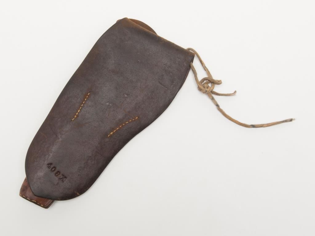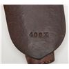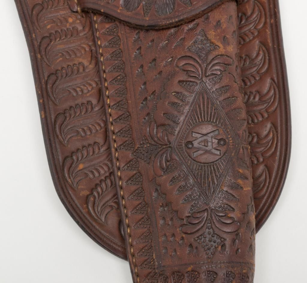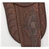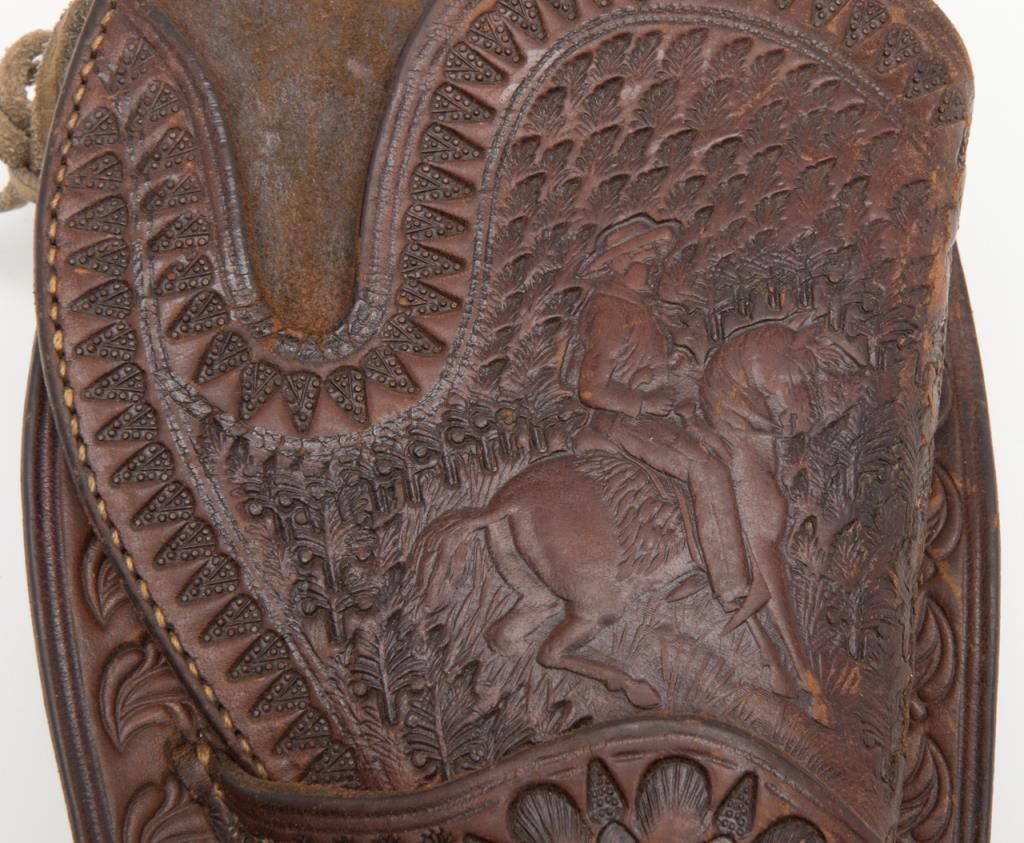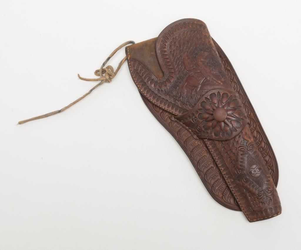 Tooled leather single loop holster with cowboy on horse image in tooling, catalog order type, for 7-1/2” SAA revolver in overall fine condition. From the estate of Joe Kiser. Est.: $600-$1,200.