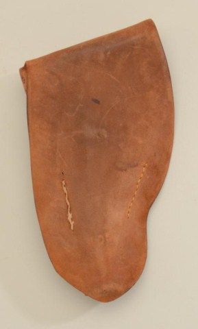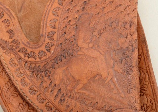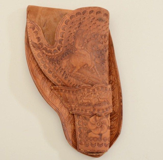 Tooled leather single loop holster with embossed cowboy and horse for a Colt SAA, unmarked but likely a stock Royal brand in overall very good condition with end plug still attached; back side marked β405β andβ4-1/2β. Est.: $150-$300.