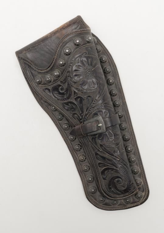 Tooled single loop leather holster for a SAA 5-1/2” revolver with metal studs, un-marked, in overall good condition; appears to be circa 1920’s-40’s; high quality construction. Est.: $75-$125.