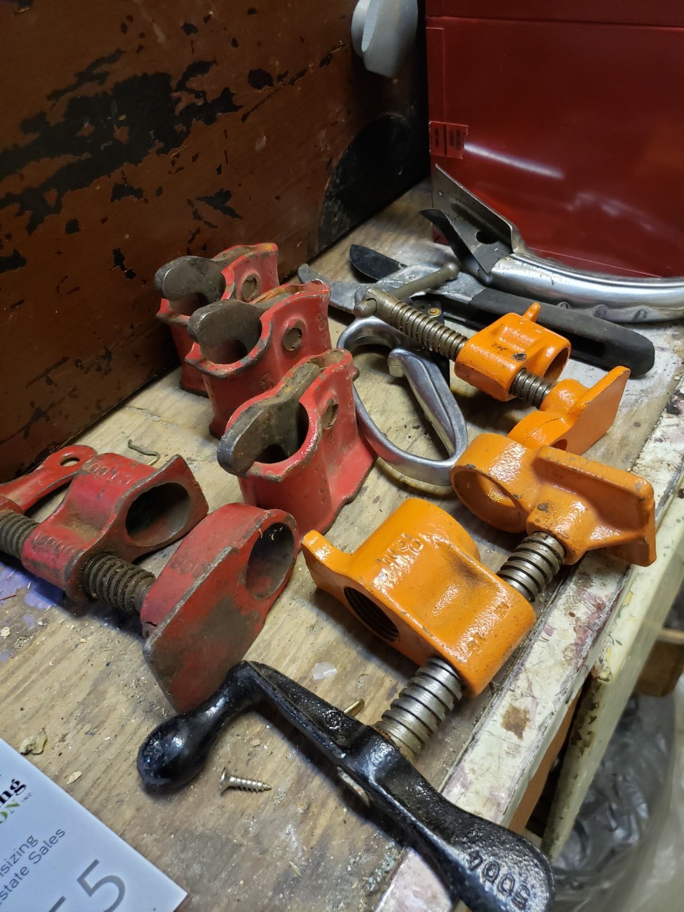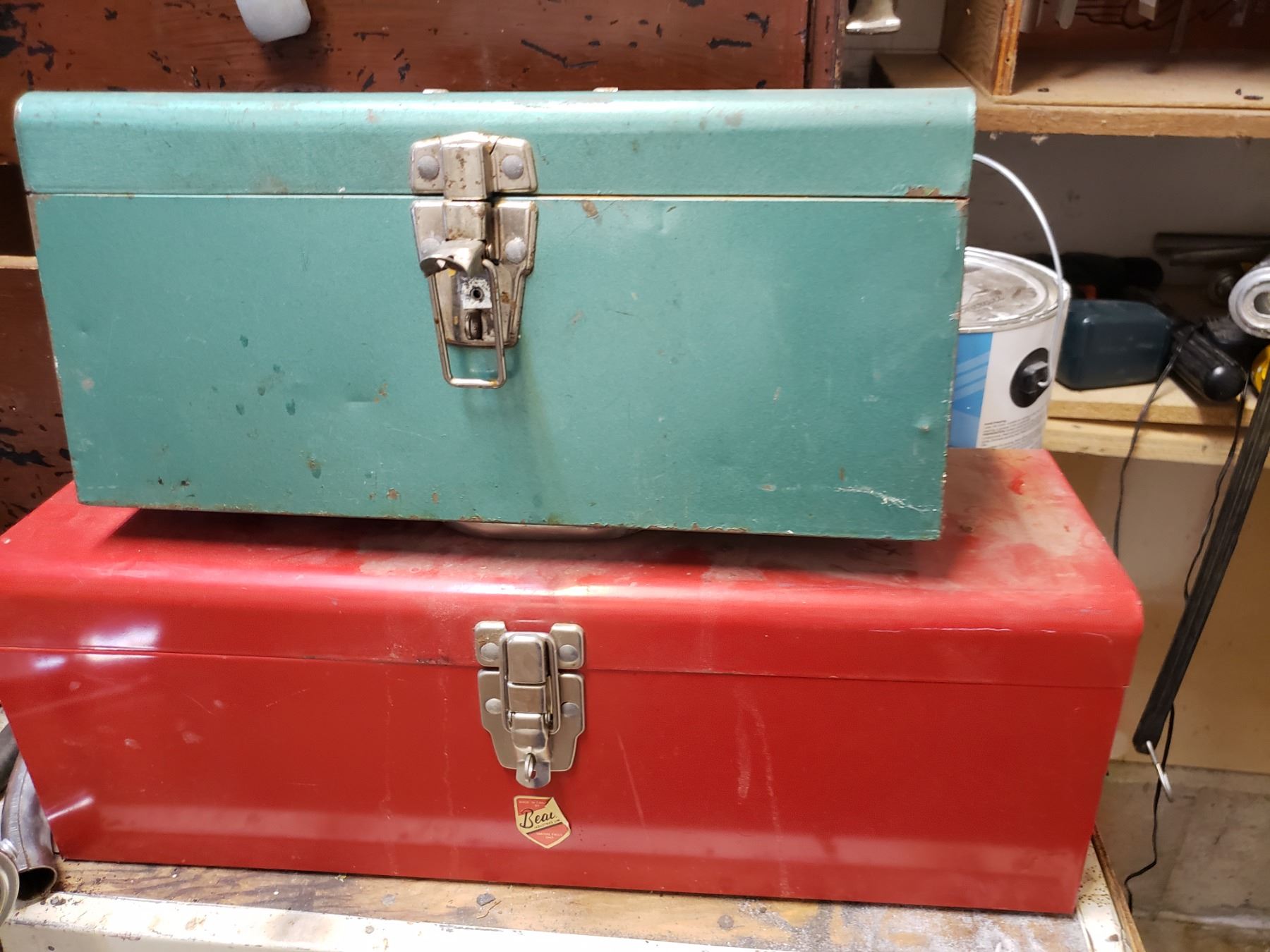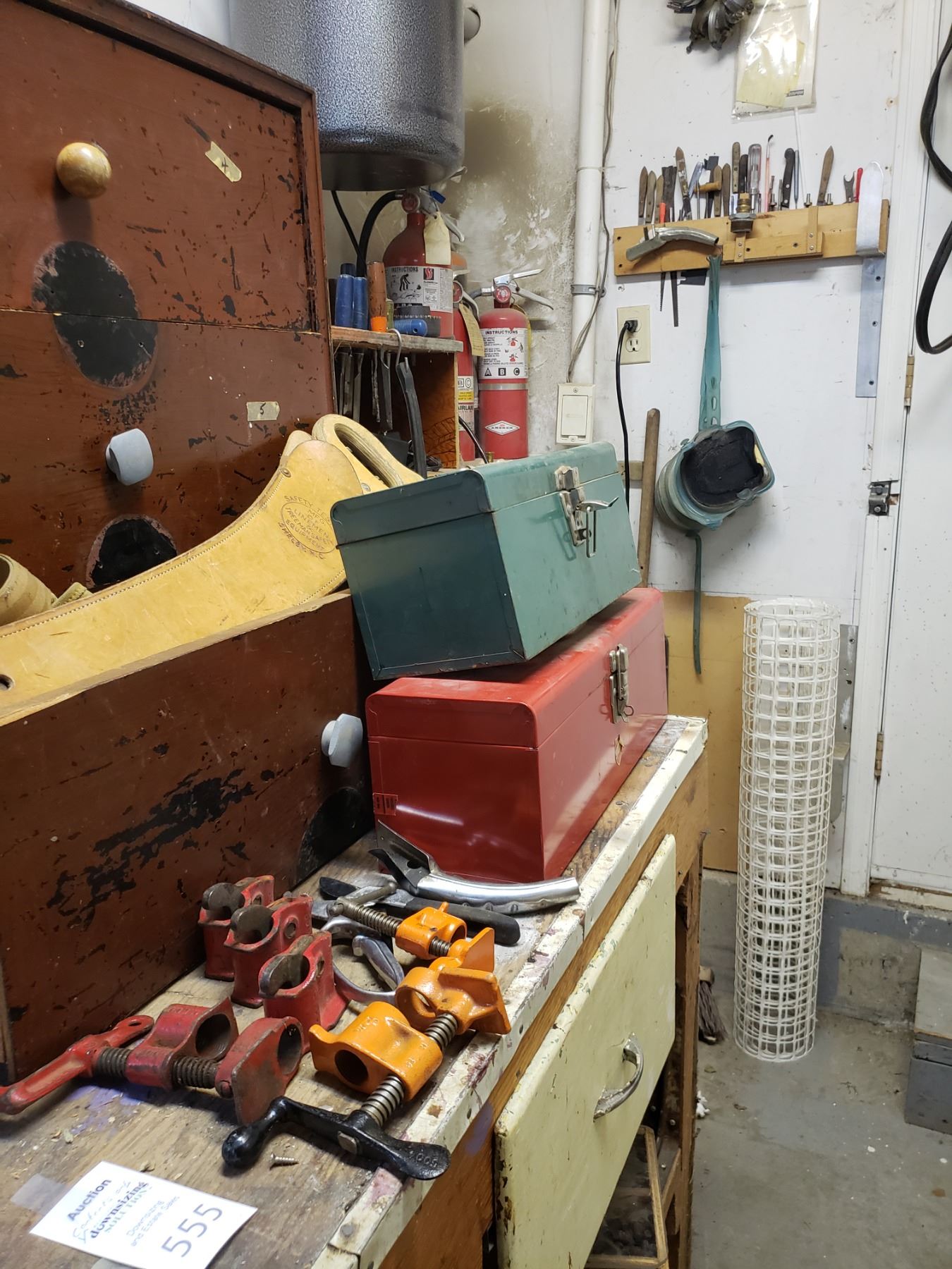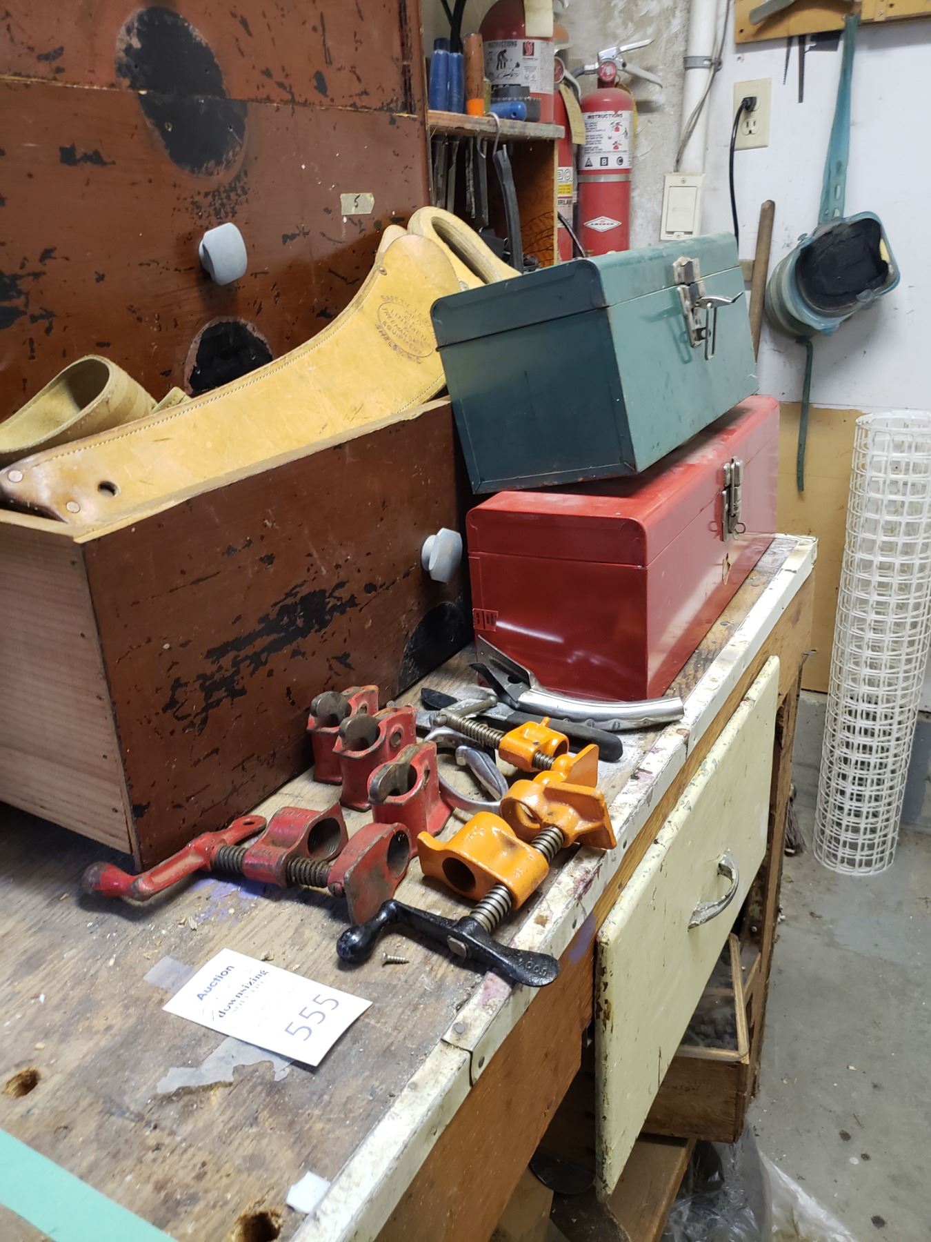 Two empty toolboxes, one with files and hammers, hand saw in leather pouch, files, screwdrivers, broom, clamps, glue gun, and more. Wood cabinet is optional. Bring packing boxes. Pickup in category C between 11am and 12pm.