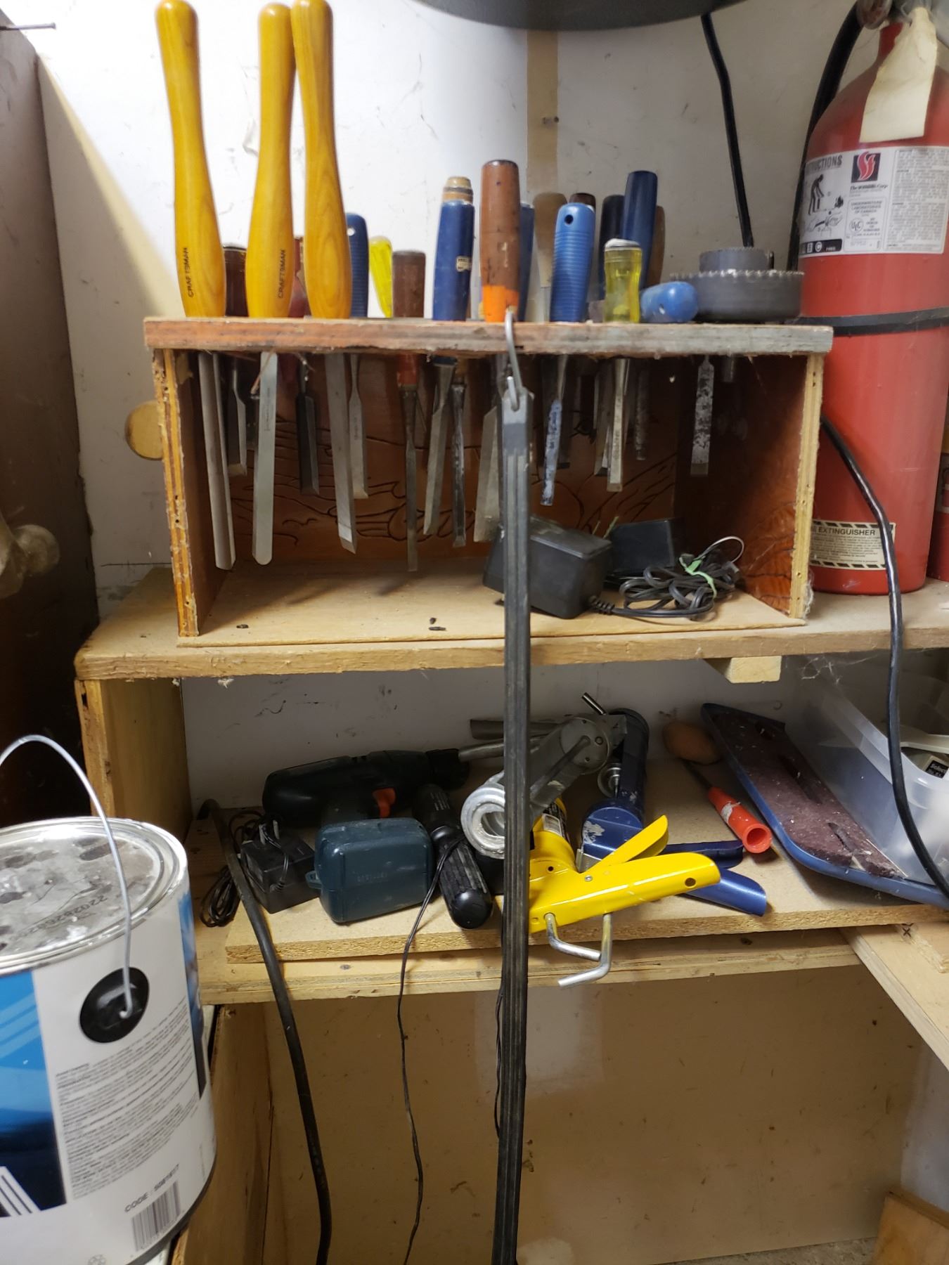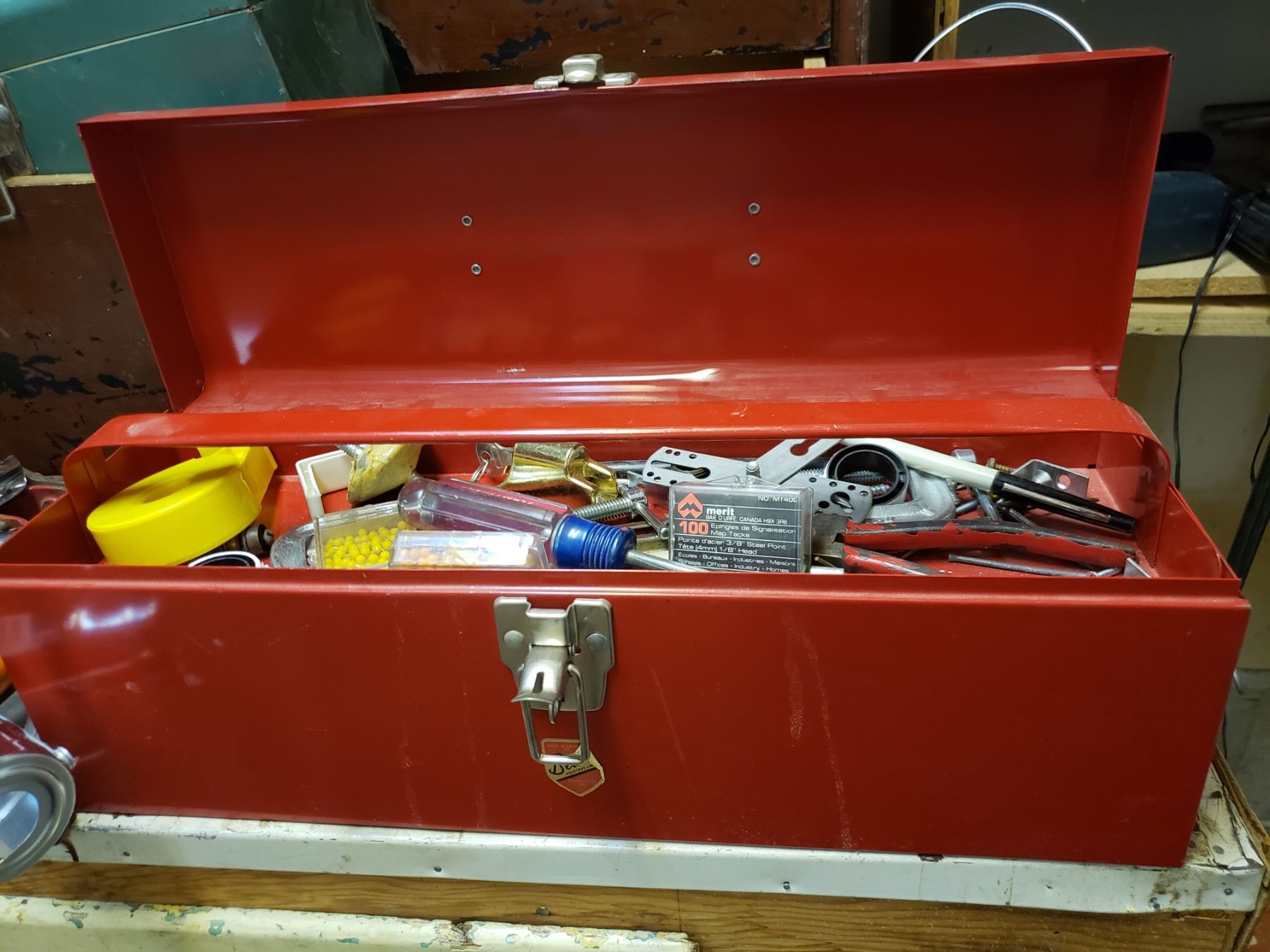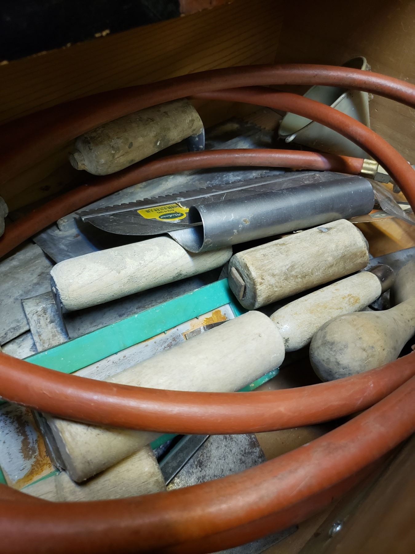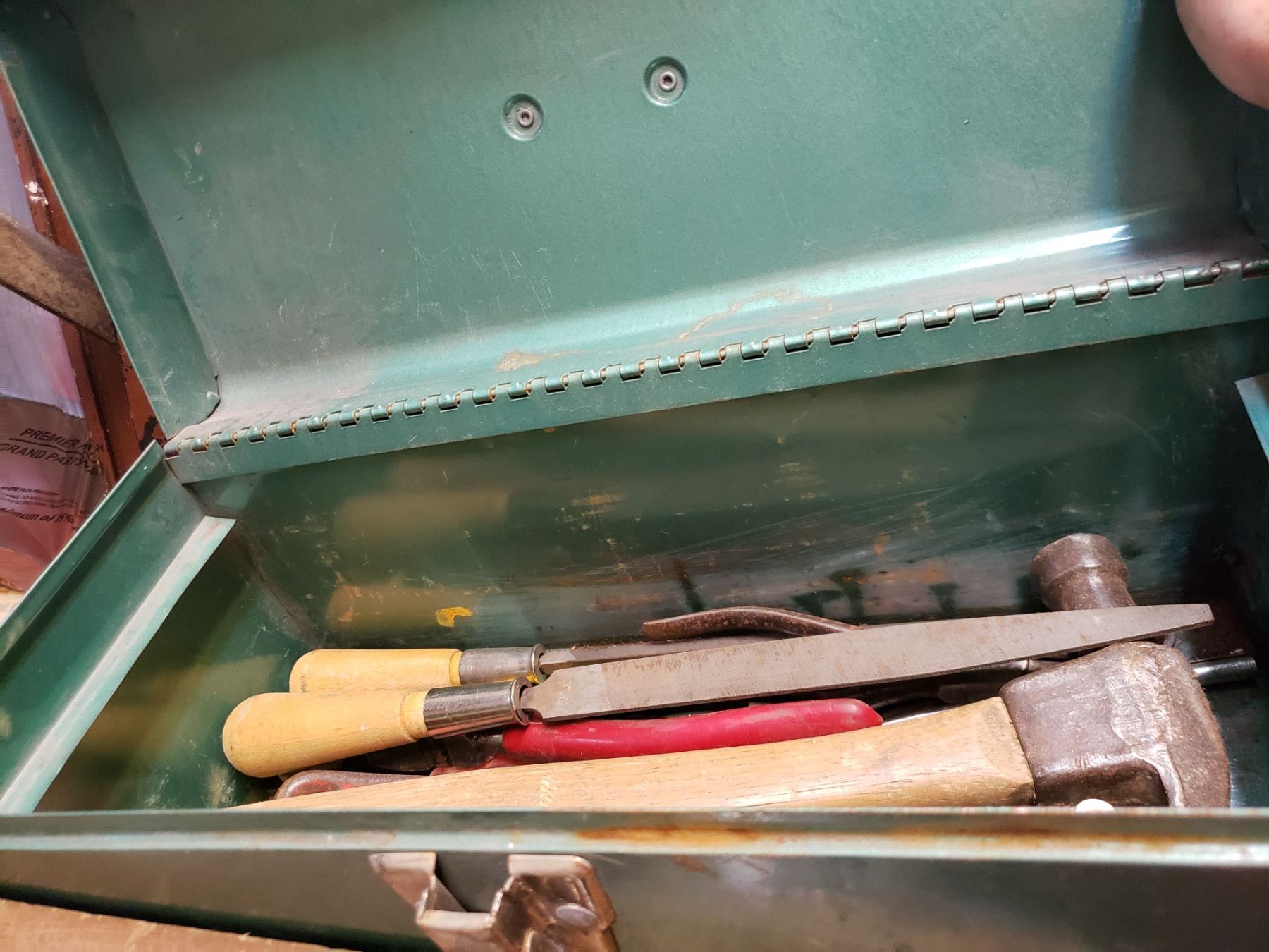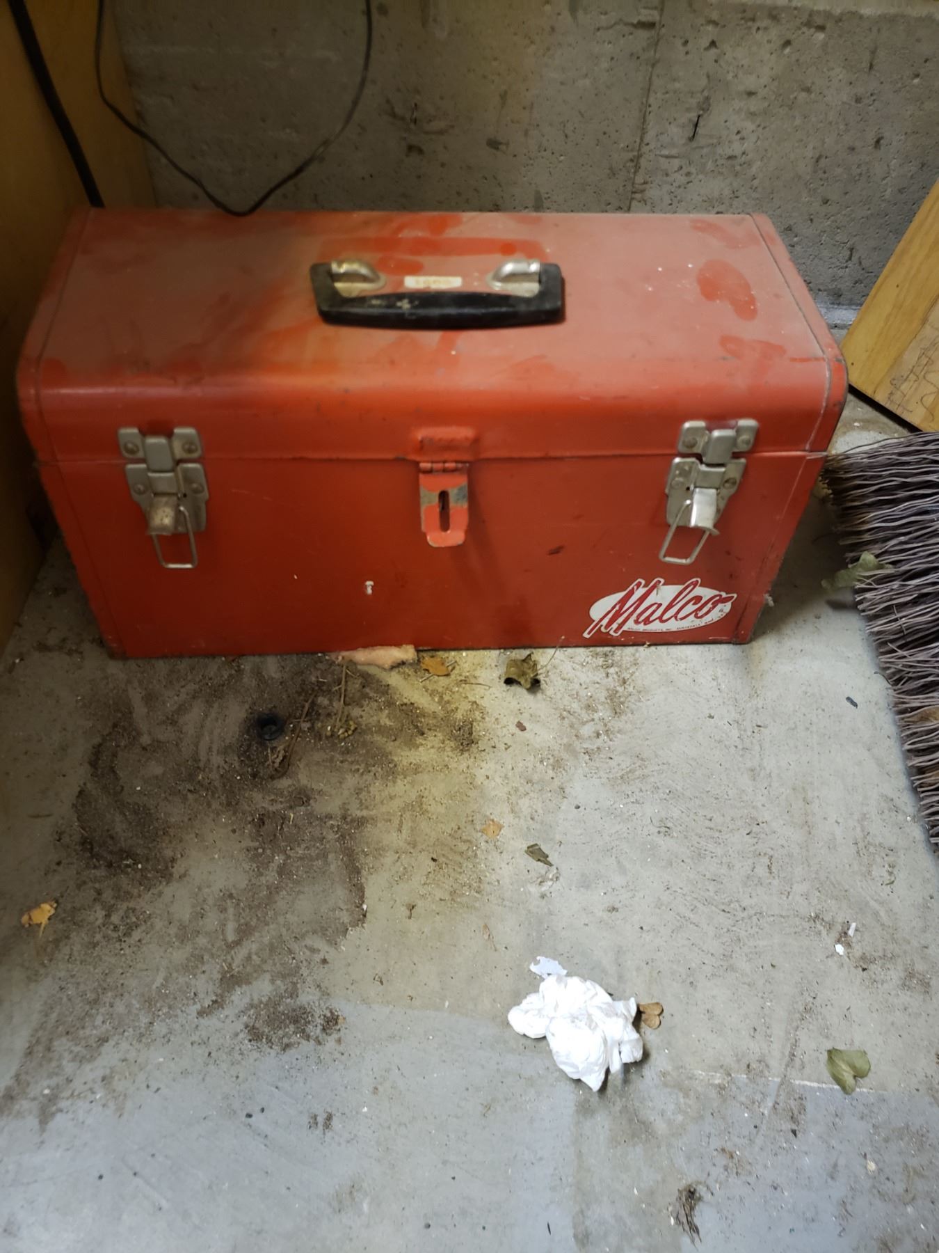 Two empty toolboxes, one with files and hammers, hand saw in leather pouch, files, screwdrivers, broom, clamps, glue gun, and more. Wood cabinet is optional. Bring packing boxes. Pickup in category C between 11am and 12pm.