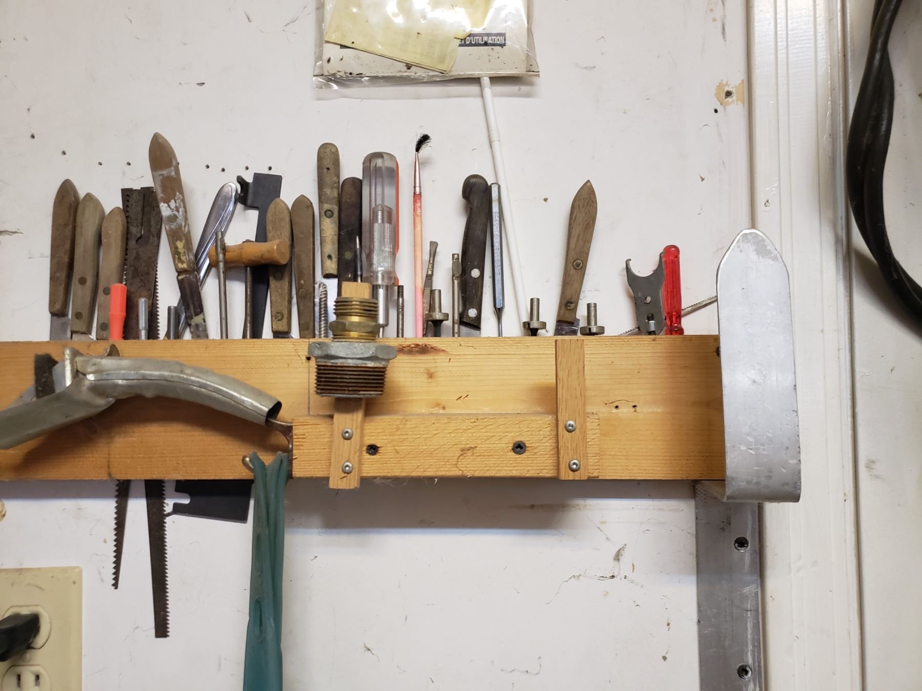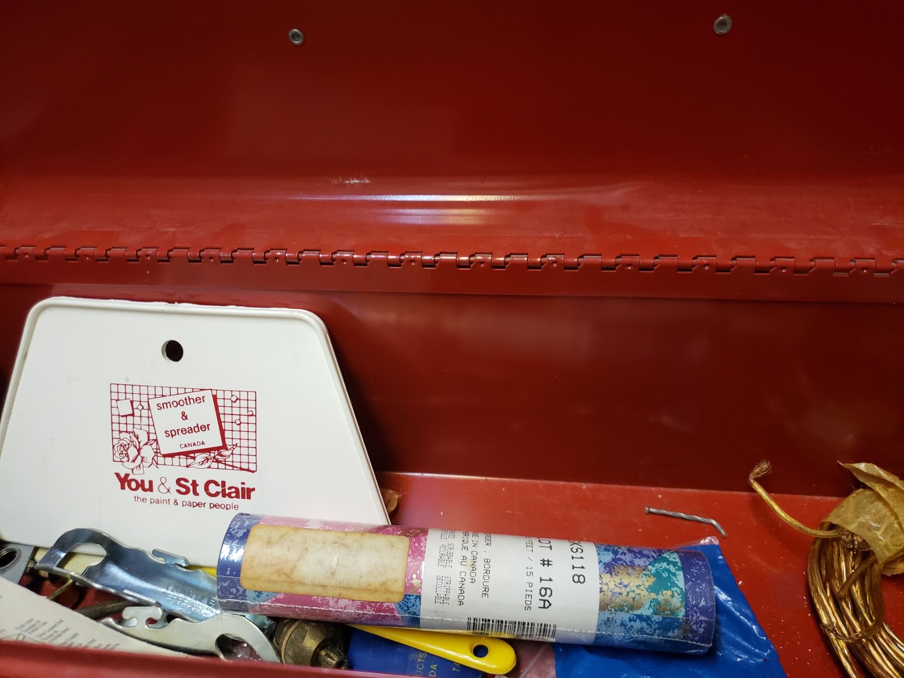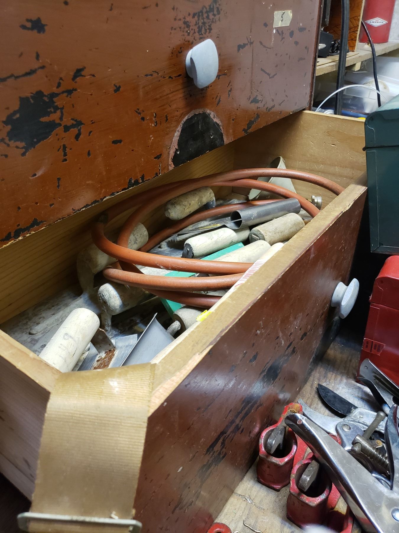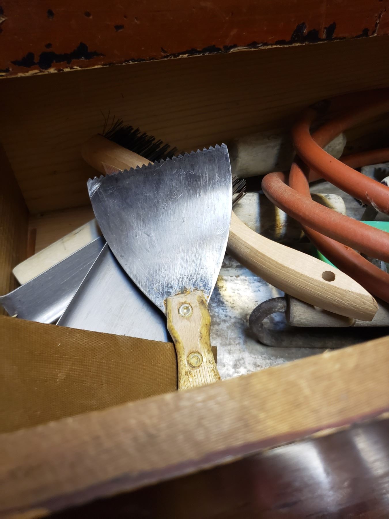 Two empty toolboxes, one with files and hammers, hand saw in leather pouch, files, screwdrivers, broom, clamps, glue gun, and more. Wood cabinet is optional. Bring packing boxes. Pickup in category C between 11am and 12pm.