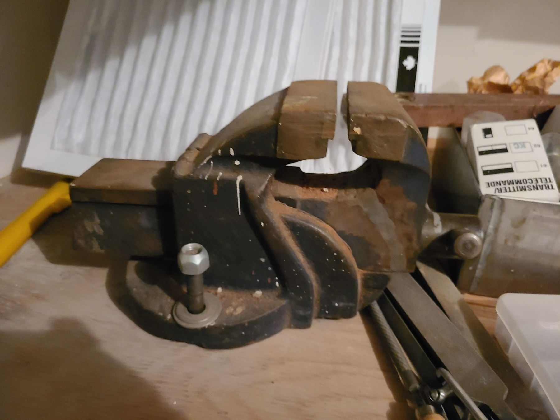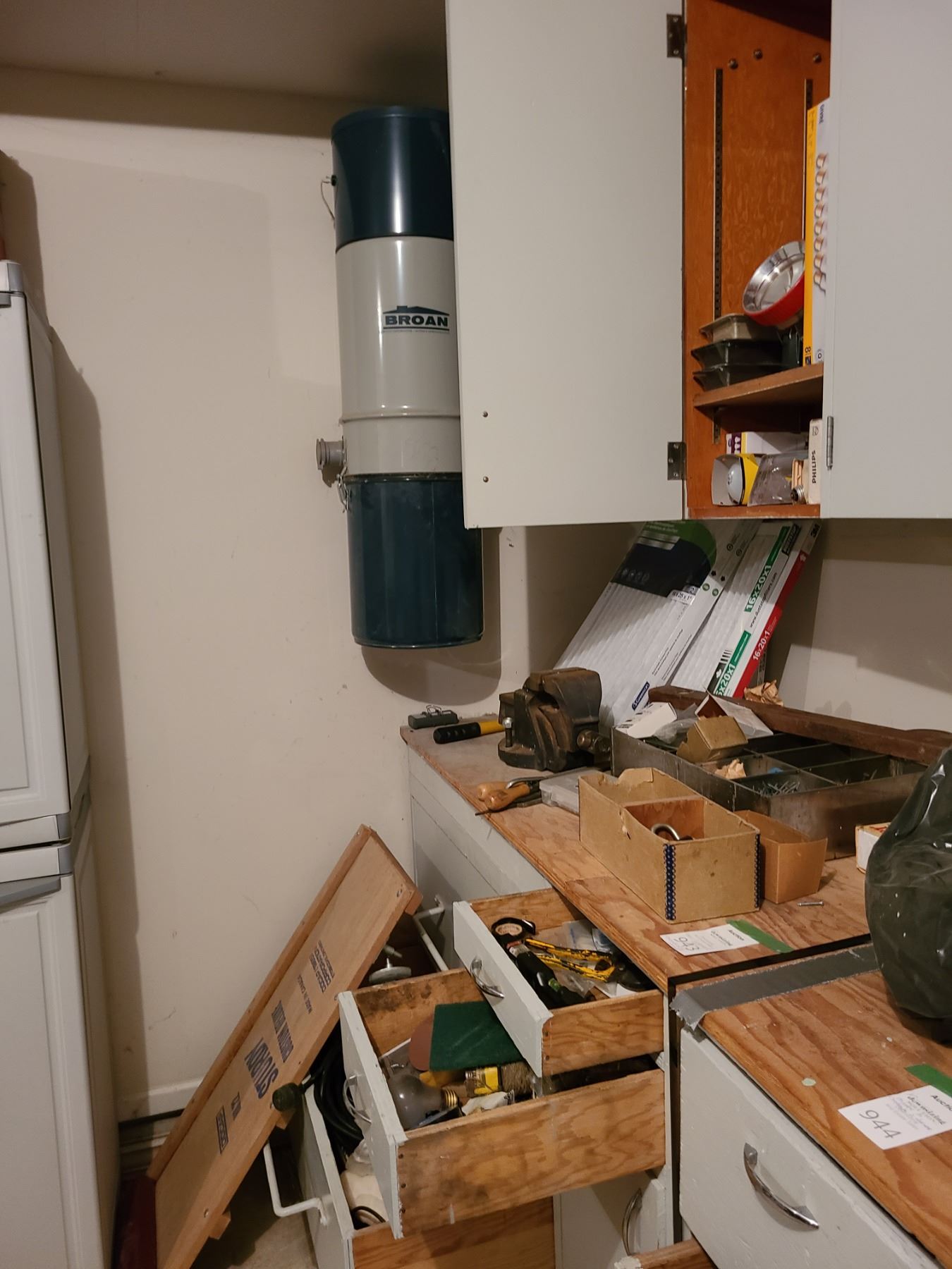 Contents of counter and 3 drawers, vase, hardware, and creeper. Pickup 9 am.