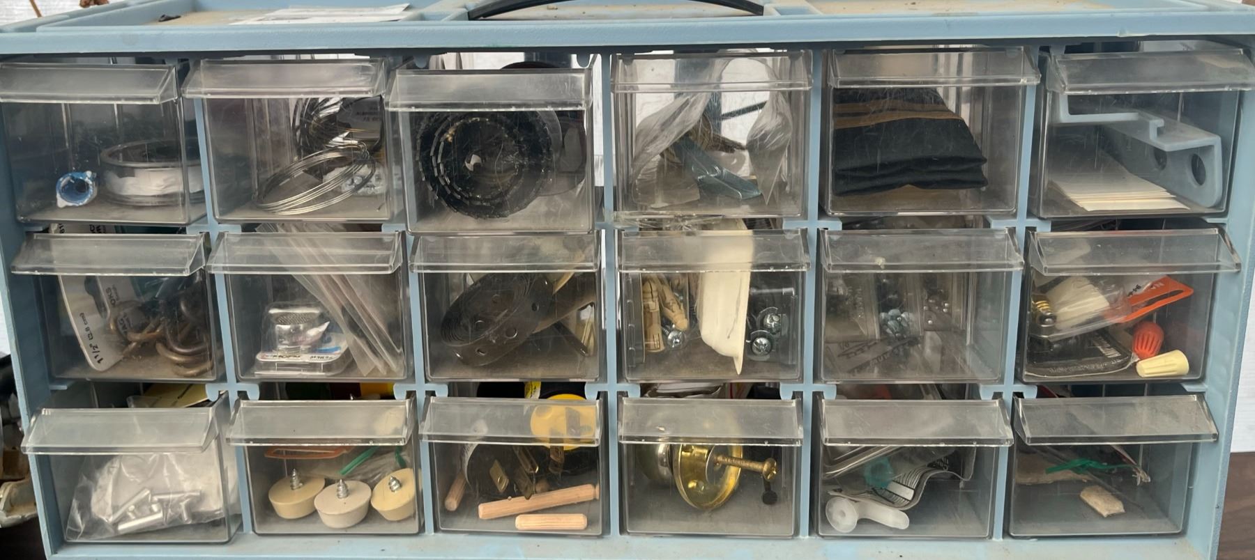 Storage Cabinet containts wire, knobs, plugs, bolts
