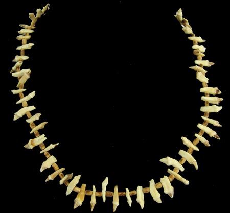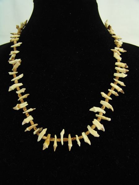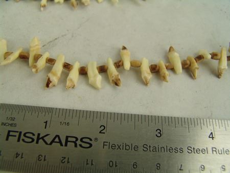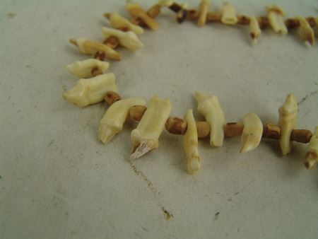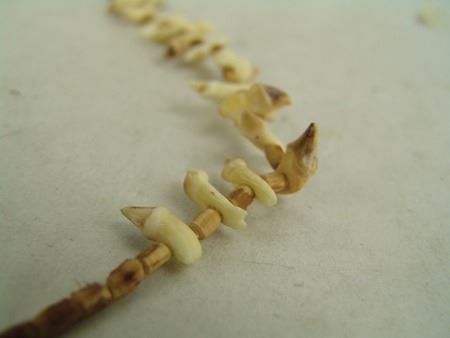 Mid/Late 1900s, Small wood bead necklace holding a slew of tiny animal teeth. Very good condition. 21"