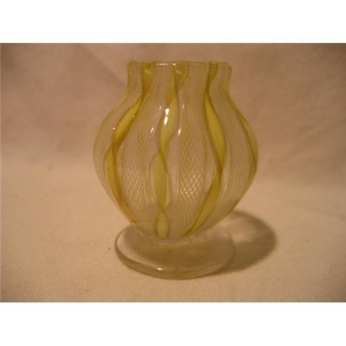 This is a beautiful, dainty little handbown glass toothpick holder with a rough pontil on the bottom. May be Czeckoslovakian/Bohemian Glass, or Venetian. It has yellow glass ribbons extending vertically; there is a thin "line" of gold dust on either side of the ribbons, and white latticino between them. It has a lovely bulbous shape and stands on a clear glass pedestal. I have another green and white latticino toothpick holder (and many other different kinds) available as well.