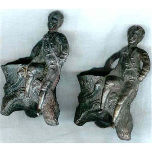A man in a tailcoat, wearing a pigtailed periwig perched on a large open log. A Magnet does not stick and a bronze colored patina shines through in places. Each Marked "Knapp"