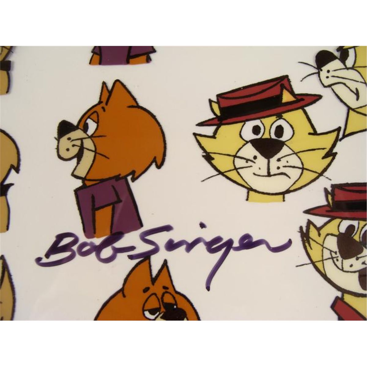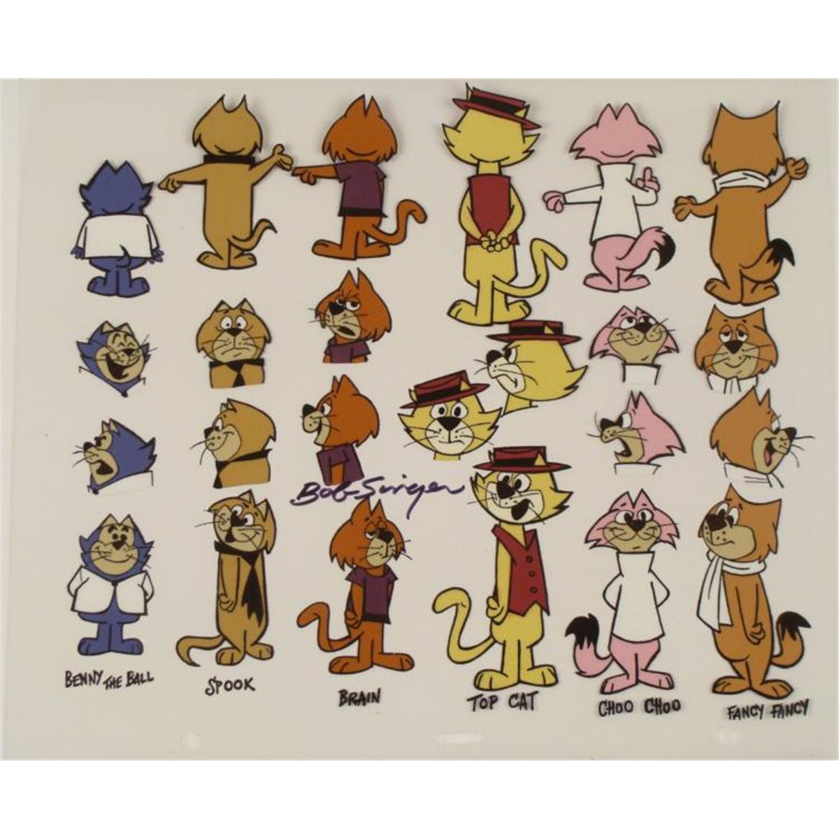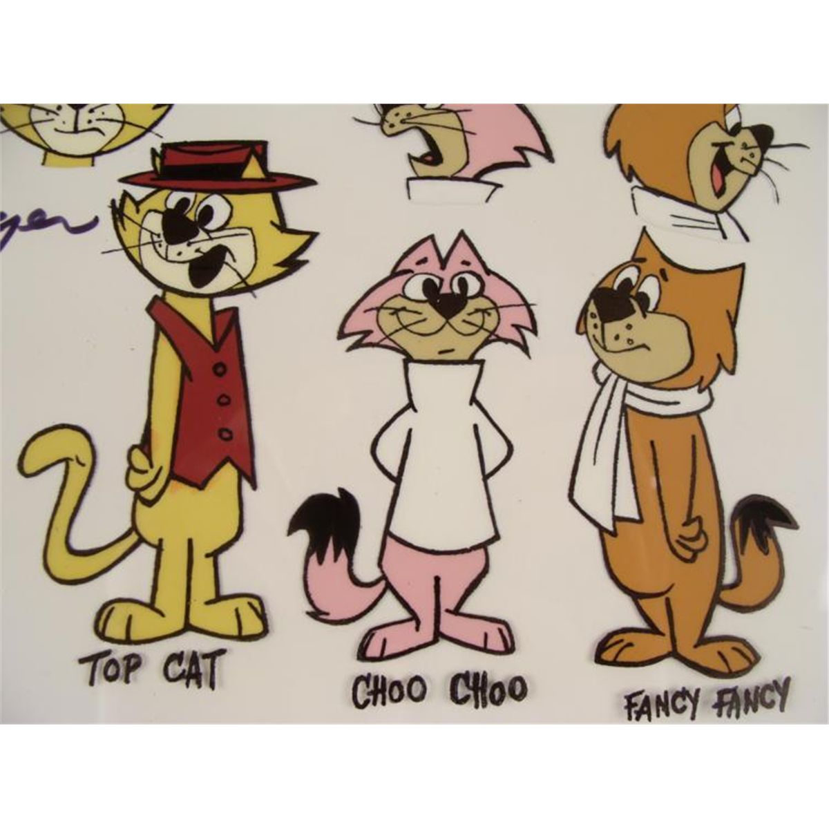 This is an original production animation model cel from the television series "Top Cat". * You get a lot packed into this cel: 24 images of Top Cat and his gang, all with their names listed. * Bob Singer's signature appears in black Sharpie at the bottom of the cel. * Bob Singer is an American animation artist, character designer, layout and background artist and storyboard director of animated television programs, most memorably of several Hanna Barbara productions such as The Flintstones, Jonny Quest, Scooby-Doo, Yogi Bear, Droopy, Tom and Jerry, The Jetsons, The Smurfs, Superfriends, and the Harlem Globe Trotters cartoons. * Top Cat, called T.C. by close friends, is the leader of a gang of New York City alley cats: Fancy-Fancy, Spook, Benny the Ball, The Brain, and Choo Choo. A frequent plot-line revolved around the local policeman, Officer Charles "Charlie" Dibble, and his ineffective attempts to evict the gang from the alley. The only reason that he wanted to be rid of them was that Top Cat and his gang were constantly attempting to earn a quick dollar-usually through an illegal scam. Dibble's appearance was modeled on Allen Jenkins, who did his voice. Dibble, previously only an implement for making holes for planting seeds, has acquired a second meaning in the vernacular as slang for police officers. * Original Animated Cel, hand-painted, with peg holes along the bottom edge Overall Size of the Cel: 10 1/2" x 12 1/2" Excellent Condition -ready to be matted and framed * This is an original cel used in the production of "Top Cat". Each one-of-a-kind set-up represents a slight change in position of the characters. When individually photographed and projected in rapid succession, the images appear to move. * To create production cels, the original animator's drawing is transferred onto an acetate cel (by hand-inking and/or photo copying). The cel is then hand-painted on the reverse side. * * *