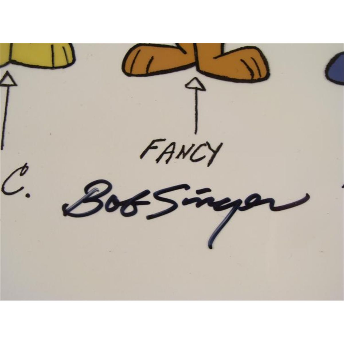 This is an original production animation model cel from the television series "Top Cat". * This cel has the main gang of alley cats, all with their names listed. * Bob Singer's signature appears in black Sharpie at the bottom of the cel. * Bob Singer is an American animation artist, character designer, layout and background artist and storyboard director of animated television programs, most memorably of several Hanna Barbara productions such as The Flintstones, Jonny Quest, Scooby-Doo, Yogi Bear, Droopy, Tom and Jerry, The Jetsons, The Smurfs, Superfriends, and the Harlem Globe Trotters cartoons. * Top Cat, called T.C. by close friends, is the leader of a gang of New York City alley cats: Fancy-Fancy, Spook, Benny the Ball, The Brain, and Choo Choo. A frequent plot-line revolved around the local policeman, Officer Charles "Charlie" Dibble, and his ineffective attempts to evict the gang from the alley. The only reason that he wanted to be rid of them was that Top Cat and his gang were constantly attempting to earn a quick dollar-usually through an illegal scam. Dibble's appearance was modeled on Allen Jenkins, who did his voice. Dibble, previously only an implement for making holes for planting seeds, has acquired a second meaning in the vernacular as slang for police officers. * Original Animated Cel, hand-painted, with peg holes along the bottom edge Overall Size of the Cel: 10 1/2" x 12 1/2" Excellent Condition -ready to be matted and framed * This is an original cel used in the production of "Top Cat". Each one-of-a-kind set-up represents a slight change in position of the characters. When individually photographed and projected in rapid succession, the images appear to move. * To create production cels, the original animator's drawing is transferred onto an acetate cel (by hand-inking and/or photo copying). The cel is then hand-painted on the reverse side. * * *