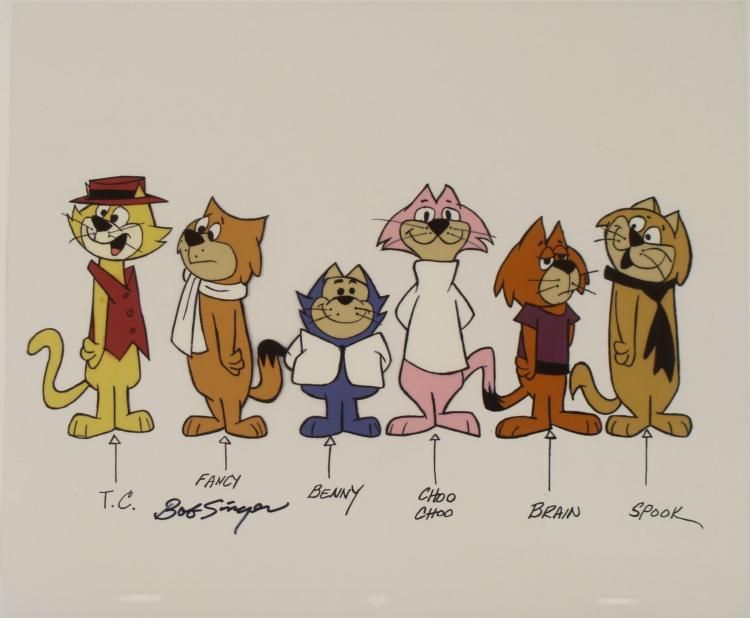 This is an original production animation model cel from the television series "Top Cat". * This cel has the main gang of alley cats, all with their names listed. * Bob Singer's signature appears in black Sharpie at the bottom of the cel. * Bob Singer is an American animation artist, character designer, layout and background artist and storyboard director of animated television programs, most memorably of several Hanna Barbara productions such as The Flintstones, Jonny Quest, Scooby-Doo, Yogi Bear, Droopy, Tom and Jerry, The Jetsons, The Smurfs, Superfriends, and the Harlem Globe Trotters cartoons. * Top Cat, called T.C. by close friends, is the leader of a gang of New York City alley cats: Fancy-Fancy, Spook, Benny the Ball, The Brain, and Choo Choo. A frequent plot-line revolved around the local policeman, Officer Charles "Charlie" Dibble, and his ineffective attempts to evict the gang from the alley. The only reason that he wanted to be rid of them was that Top Cat and his gang were constantly attempting to earn a quick dollar-usually through an illegal scam. Dibble's appearance was modeled on Allen Jenkins, who did his voice. Dibble, previously only an implement for making holes for planting seeds, has acquired a second meaning in the vernacular as slang for police officers. * Original Animated Cel, hand-painted, with peg holes along the bottom edge Overall Size of the Cel: 10 1/2" x 12 1/2" Excellent Condition -ready to be matted and framed * This is an original cel used in the production of "Top Cat". Each one-of-a-kind set-up represents a slight change in position of the characters. When individually photographed and projected in rapid succession, the images appear to move. * To create production cels, the original animator's drawing is transferred onto an acetate cel (by hand-inking and/or photo copying). The cel is then hand-painted on the reverse side. * * *