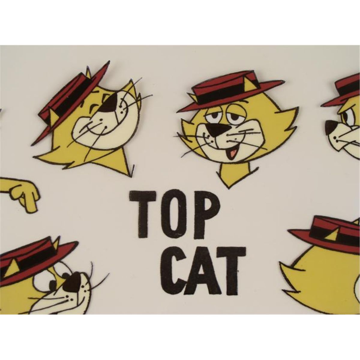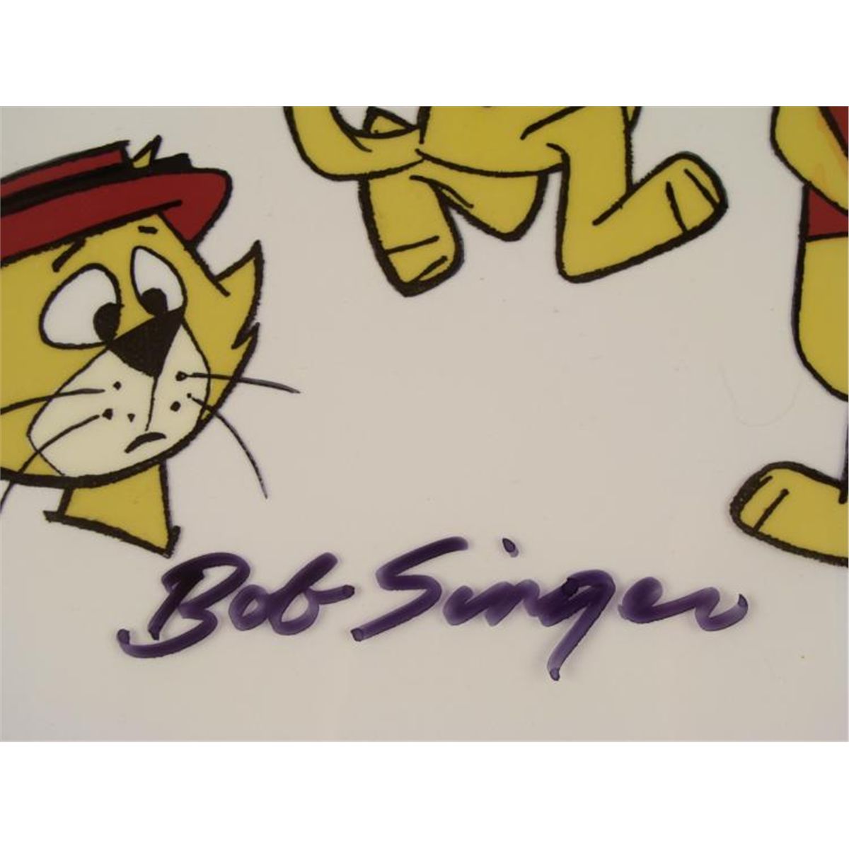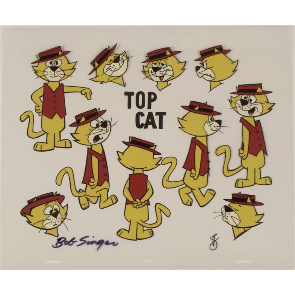 This is an original production animation model cel from the television series "Top Cat". * This model cel was made to provide a variety of different poses and expressions of that snazzy main character. * Bob Singer's signature appears in black Sharpie at the bottom of the cel. * Bob Singer is an American animation artist, character designer, layout and background artist and storyboard director of animated television programs, most memorably of several Hanna Barbara productions such as The Flintstones, Jonny Quest, Scooby-Doo, Yogi Bear, Droopy, Tom and Jerry, The Jetsons, The Smurfs, Superfriends, and the Harlem Globe Trotters cartoons. * Top Cat, called T.C. by close friends, is the leader of a gang of New York City alley cats: Fancy-Fancy, Spook, Benny the Ball, The Brain, and Choo Choo. A frequent plot-line revolved around the local policeman, Officer Charles "Charlie" Dibble, and his ineffective attempts to evict the gang from the alley. The only reason that he wanted to be rid of them was that Top Cat and his gang were constantly attempting to earn a quick dollar-usually through an illegal scam. Dibble's appearance was modeled on Allen Jenkins, who did his voice. Dibble, previously only an implement for making holes for planting seeds, has acquired a second meaning in the vernacular as slang for police officers. * Original Animated Cel, hand-painted, with peg holes along the bottom edge Overall Size of the Cel: 10 1/2" x 12 1/2" Excellent Condition -ready to be matted and framed * This is an original cel used in the production of "Top Cat". Each one-of-a-kind set-up represents a slight change in position of the characters. When individually photographed and projected in rapid succession, the images appear to move. * To create production cels, the original animator's drawing is transferred onto an acetate cel (by hand-inking and/or photo copying). The cel is then hand-painted on the reverse side. * * *