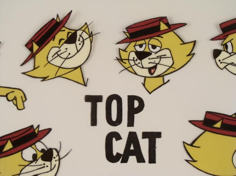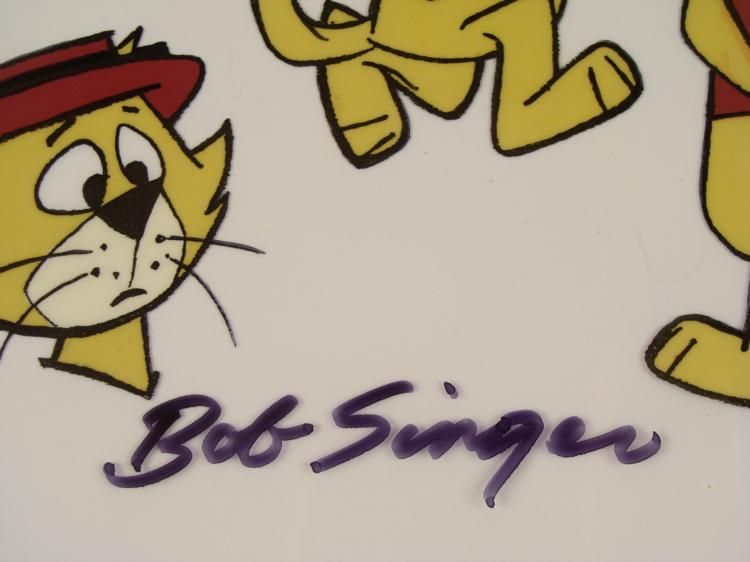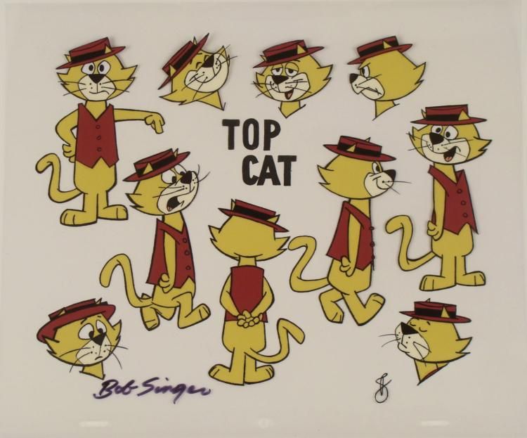 This is an original production animation model cel from the television series "Top Cat". This model cel was made to provide a variety of different poses and expressions of that snazzy main character.Bob Singer's signature appears in black Sharpie at the bottom of the cel.Bob Singer is an American animation artist, character designer, layout and background artist and storyboard director of animated television programs, most memorably of several Hanna Barbara productions such as The Flintstones, Jonny Quest, Scooby-Doo, Yogi Bear, Droopy, Tom and Jerry, The Jetsons, The Smurfs, Superfriends, and the Harlem Globe Trotters cartoons.Top Cat, called T.C. by close friends, is the leader of a gang of New York City alley cats: Fancy-Fancy, Spook, Benny the Ball, The Brain, and Choo Choo. A frequent plot-line revolved around the local policeman, Officer Charles "Charlie" Dibble, and his ineffective attempts to evict the gang from the alley. The only reason that he wanted to be rid of them was that Top Cat and his gang were constantly attempting to earn a quick dollar-usually through an illegal scam. Dibble's appearance was modeled on Allen Jenkins, who did his voice. Dibble, previously only an implement for making holes for planting seeds, has acquired a second meaning in the vernacular as slang for police officers.Original Animated Cel, hand-painted, with peg holes along the bottom edge Overall Size of the Cel: 10 1/2" x 12 1/2" Excellent Condition -ready to be matted and framedThis is an original cel used in the production of "Top Cat". Each one-of-a-kind set-up represents a slight change in position of the characters. When individually photographed and projected in rapid succession, the images appear to move.To create production cels, the original animator's drawing is transferred onto an acetate cel (by hand-inking and/or photo copying). The cel is then hand-painted on the reverse side.