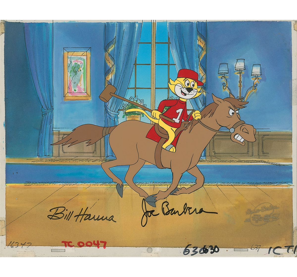 (Hanna-Barbera Studios, 1987) Original production cel and production background featuring Top Cat from Top Cat and the Beverly Hill Cats, signed in black felt tip by Bill Hanna and Joe Barbera. The cel is placed on a matching color copy background. Image measures 9 x 6, with overall dimensions of 13 x 10.5. Hanna-Barbera seal to lower right. In fine condition.