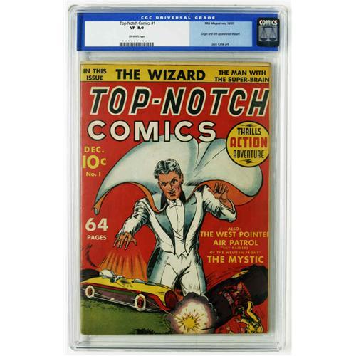 <B>Top-Notch Comics #1 (MLJ, 1939) CGC VF 8.0 Off-white pages.</B></I> This is the second comic book series produced by the company which would one day be known as Archie Comics, appearing just a month after the firm's first effort, <B>Blue Ribbon Comics</B></I>. This issue has the first appearance of the Wizard, who would become one of MLJ's top superheroes. The content of the issue was produced by the Harry "A" Chesler shop, most notably Jack Cole. Overstreet 2005 VF 8.0 value = $4,067. CGC census 12/05: 1 in 8.0, 3 higher.