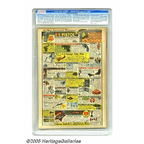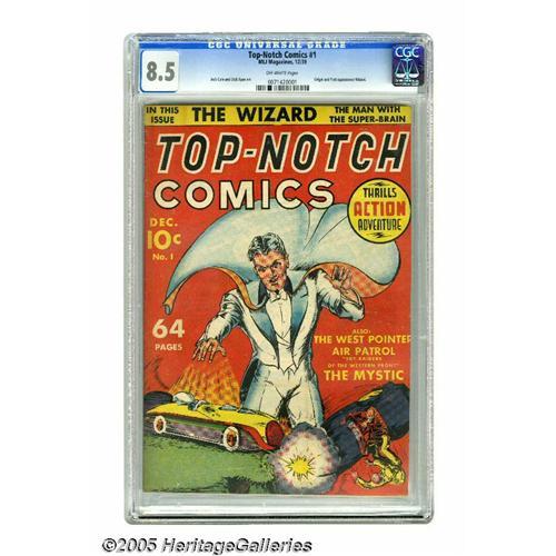 <B>Top-Notch Comics #1 (MLJ, 1939) CGC VF+ 8.5 Off-white pages.</B></I> Only one copy of this book has been graded higher than our copy. The issue is best known for having the first appearance of the Wizard. It's one of the earliest comics from the publisher that would later be known as Archie. The book's interior artists include Jack Cole. Overstreet 2005 VF 8.0 value = $4,067; VF/NM 9.0 value = $6,534. CGC census 7/05: 2 in 8.5, 1 higher. <BR><BR><B>Important notice:</B> Heritage usually auctions material at the rate of 200-250 lots per hour. On some occasions eBay Live bid software or the Internet may not be able to keep up with the pace of the auction. We recommend placing a realistic absentee bid now as insurance to avoid disappointment. Occasionally the auctioneer may eliminate or reject an eBay Live bid, and the auctioneer may also reopen a lot after the close of the eBay live bidding (usually because we missed an audience bid), and may reject your bid even if it shows you as the winning bidder. By bidding via eBay Live, you agree that Heritage may award the lot to another bidder at its sole discretion under the circumstances described above or any other reasonable circumstances. Since eBay bids are not shown to us until we open the lot on the floor, we treat those bids just like floor bids. In most cases the floor responds before the eBay bid is presented to us, due to Internet lag time, so for consistency we have made it a policy that floor bids are always considered first over tie eBay live bids. Also please note that all Heritage lots purchased through eBay Live carry a 20% Buyer's Premium. Please make sure you read the Terms and Conditions before you bid. This lot is being auctioned in conjunction with a live floor auction by Heritage Galleries & Auctioneers. All final auction and invoice information will be supplied by Heritage Galleries & Auctioneers, and all other information should be considered preliminary. Lot:2506 <BR><BR><B>Winning Notification a