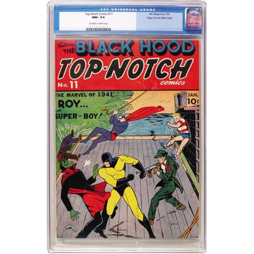<B>Top-Notch Comics #11 Mile High pedigree (MLJ, 1941) CGC NM+ 9.6 Off-white to white pages.</B></I> This lovely Mile High book is the only copy of the issue graded above VF by CGC as of this writing. That's the Skull menacing the Black Hood on the cover, luckily our hero gets an assist from the Wizard and Roy the Super-Boy. The cover's by Al Camy. Overstreet 2006 NM- 9.2 value = $1,460. CGC census 3/07: 1 in 9.6, none higher.<BR><BR><b>Shipping:</b> Slabbed Comic (<a target="_blank" href="http://www.heritageauctions.com/common/shipping.php">view shipping information</a>)
