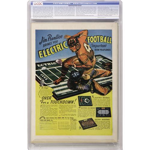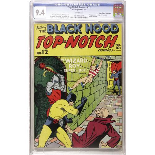 <B>Top-Notch Comics #12 Mile High pedigree (MLJ, 1941) CGC NM 9.4 White pages.</B></I> Quick introductions here: that's the Wizard dashing into the picture, Roy the Super Boy swinging into action, and the Black Hood dishing out an uppercut. Adding even more punch to the book was boxing character Jim Jennings ("the St. Louis Kid"), who made his first appearance in this issue. The cover is by Al Camy, and there's also Irv Novick interior art. As usual, "top-notch" also describes the condition of this Mile High copy (with white pages, no less). This is one of only two copies that CGC has certified to date, and far ahead of the FN runner-up. Overstreet 2006 NM- 9.2 value = $1,460. CGC census 10/06: 1 in 9.4, none higher.<BR><BR><b>Shipping:</b> Slabbed Comic (<a target="_blank" href="http://www.heritageauctions.com/common/shipping.php">view shipping information</a>)