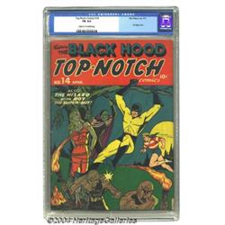 Top-Notch Comics #14 (MLJ, 1941) CGC FN 6.0 Cream to off-white pages. Al Camy bondage cover, with the Black Hood and Roy the Super Boy. The Wizard appears inside, but didn't make the cover of this issue. There are currently only two copies of this issue that have been graded higher by CGC. Overstreet 2003 FN 6.0 value = $306. Important notice: Heritage usually auctions material at the rate of 200-250 lots per hour. On some occasions eBay Live bid software or the Internet may not be able to keep up with the pace of the auction. We recommend placing a realistic absentee bid now as insurance to avoid disappointment. Occasionally the auctioneer may eliminate or reject an eBay Live bid, and the auctioneer may also reopen a lot after the close of the eBay live bidding (usually because we missed an audience bid), and may reject your bid even if it shows you as the winning bidder. By bidding via eBay Live, you agree that Heritage may award the lot to another bidder at its sole discretion under the circumstances described above or any other reasonable circumstances. Since eBay bids are not shown to us until we open the lot on the floor, we treat those bids just like floor bids. In most cases the floor responds before the eBay bid is presented to us, due to Internet lag time, so for consistency we have made it a policy that floor bids are always considered first over tie eBay live bids. Also please note that all Heritage lots purchased through eBay Live carry a 20% Buyer's Premium. Please make sure you read the Terms and Conditions before you bid.