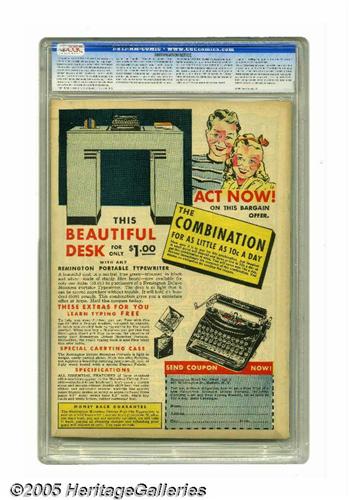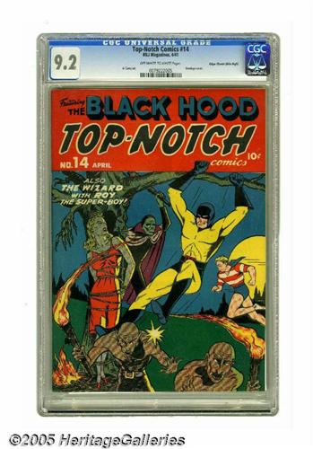 <B>Top-Notch Comics #14 Mile High pedigree (MLJ, 1941) CGC NM- 9.2 Off-white to white pages.</B></I> A bondage cover means a damsel in distress, and that means it's time for the Black Hood! He's assisted on the cover by the Wizard's sidekick Roy the Super-Boy. This copy from the Edgar Church collection is the highest-graded example that CGC has certified to date, and the only one graded higher than VF- 7.5. Overstreet 2005 NM- 9.2 value = $1,400. CGC census 6/05: 1 in 9.2, none higher.